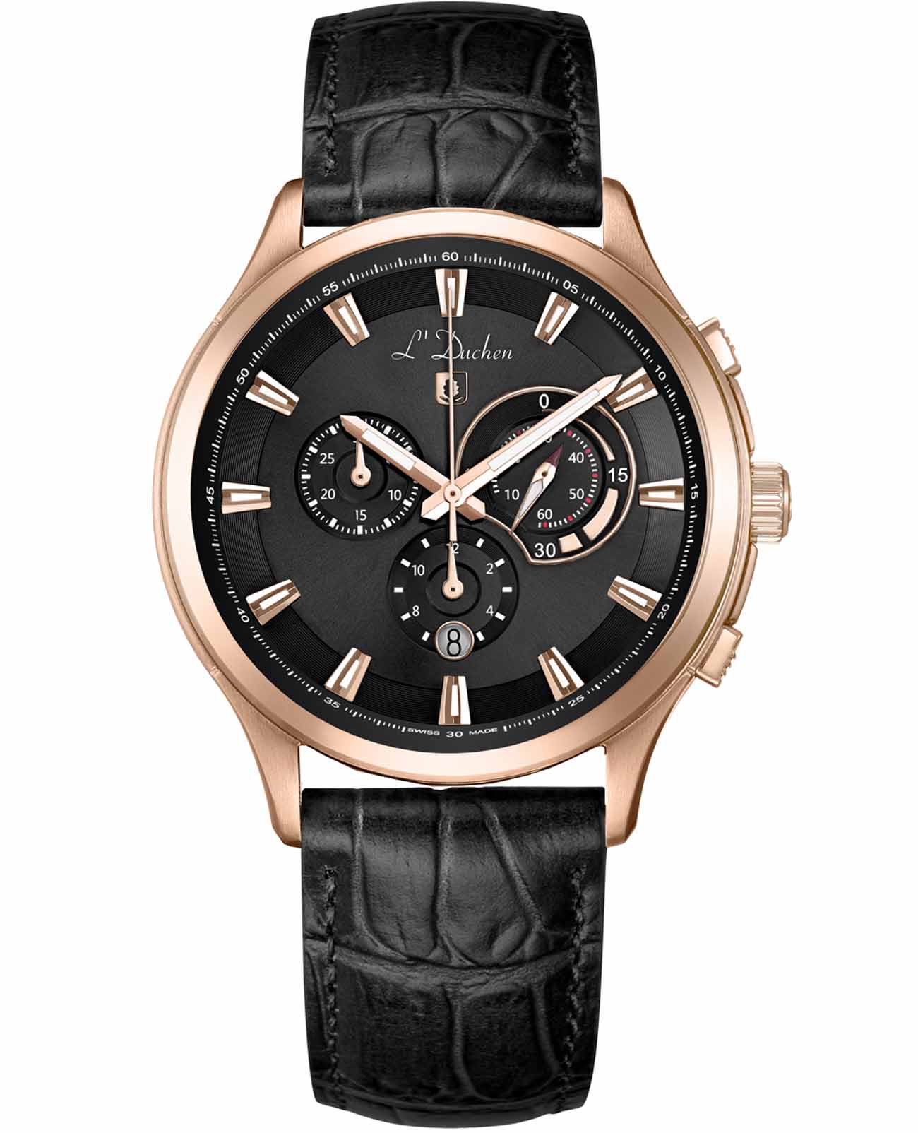 Мужские швейцарские часы- хронографХронографФункция позволяет измерять отрезки времени с особой точностью: часы, минуты, секунды. Верным признаком хронографа является наличие на циферблате 3 дополнительных окошек-счётчиков. L'Duchen Pilotage D 742.41.41, кварцевый механизм с высокой точностью. Сапфировое стеклоСапфировое стеклоПрочный и надёжный материал из кристалла сапфира синтетического происхождения, характеризующийся особой твёрдостью и устойчивостью к царапинам и повреждениям. устойчивое к появлению царапин, обладающее высокой прозрачностью. Корпус часов выполнен из нержавеющей стали с PVD-покрытиемPVDУльтратонкое покрытие наносится в технике вакуумного напыления, сочетает в себе нитрид титана особой прочности со слоем золота или оксида хрома. Несёт в себе декоративную или защитную функцию.. Стрелки с люминесцентным покрытиемЛюминесцентное покрытиеПозволяет считывать показания времени в темноте. Производители наносят на стрелки, часовые индексы, безель или поверхность циферблата светонакопительный состав, дающий холодное свечение.. Класс водозащиты: 100 метров, позволит плавать, нырять и заниматься другими водными видами спорта. Кожаный ремешок на застёжке «бабочка» с кнопкамиЗастёжка "бабочка"Такой вид застёжки дополняется предохранителями, помогающими избежать случайного раскрытия браслета. Обладают изящным исполнением. .