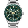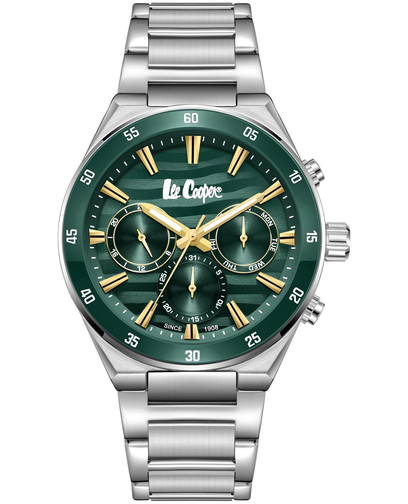 Мужские наручные часы Lee Cooper LC08175.370 оснащены кварцевым механизмом, обеспечивающий высокую точность хода и надежность. Элегантный корпус часов выполнен из суперметалла серебристого цвета, что делает их устойчивыми к внешним воздействиям и придает благородный вид. Циферблат украшен классическими стрелками с люминесцентным покрытиемЛюминесцентное покрытиеПозволяет считывать показания времени в темноте. Производители наносят на стрелки, часовые индексы, безель или поверхность циферблата светонакопительный состав, дающий холодное свечение., гармонично дополняющим общий дизайн модели. Для защиты циферблата используется минеральное стеклоМинеральное стеклоМинеральное стекло представляет собой искусственно выращенный минерал кварца. Такое стекло отличается особой устойчивостью к повреждениям и царапинам. Уступает по некоторым качествам сапфировому стеклу., устойчивое к царапинам и механическим повреждениям. Неподвижный безельБезельВнешний ободок, закрепляющий стекло. В спортивных часах так называется поворотное кольцо с делениями на циферблате, выполняет роль таймера – замеряет отрезки времени на шкале. Неподвижный безель – элемент декора. Однонаправленно вращающийся безель на дайверских часах позволяет фиксировать моменты погружения и выныривания на поверхность. с IP-покрытиемIP-покрытиеМетод ионного напыления. Демонстрирует повышенную устойчивость к истиранию, окислению и химическим веществам. Под воздействием высокого давления и температуры около 1500°C молекулы металла надёжно соединяются с частицами корпуса часов. зеленого цвета. Корпус имеет круглую форму диаметром 43 мм, что делает часы заметными и подходящими. Браслет из стали оснащен раскладной застёжкойРаскладная застёжкаТакой тип застёжки используется только на браслетах из металла. Она никогда не раскрывается полностью, происходит разделение на 2 и более частей. Раскладывающая застёжка снизит вероятность потери часов к минимуму., обеспечивающим комфортное и безопасное ношение. Вынесенный циферблат с 24-х часовым указателем времени, индикацией даты и дня недели. Часы обладают водонепроницаемостью до 50 метров (5 АТМ), что позволяет использовать их в повседневной жизни, включая контакт с водой при мытье рук или дожде. Эти часы станут идеальным выбором для мужчин, ценящих стиль, качество и функциональность.