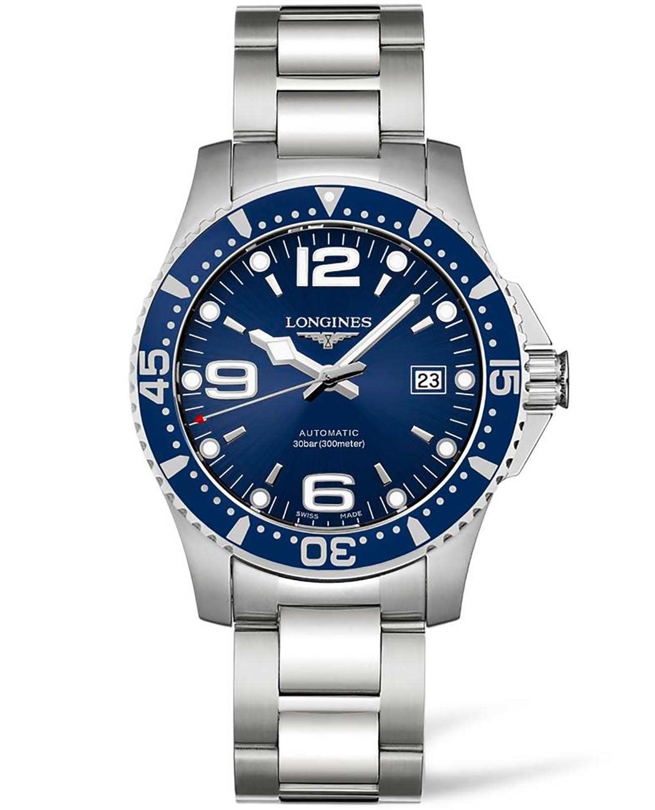 Мужские механические швейцарские часы с автоподзаводом Longines HydroConquest L3.742.4.96.6. Сапфировое стеклоСапфировое стеклоПрочный и надёжный материал из кристалла сапфира синтетического происхождения, характеризующийся особой твёрдостью и устойчивостью к царапинам и повреждениям. с антибликовым покрытием, устойчивое к мелким механическим повреждениям. Корпус часов изготовлен из нержавеющей стали. Вращающийся стальной безельБезельВнешний ободок, закрепляющий стекло. В спортивных часах так называется поворотное кольцо с делениями на циферблате, выполняет роль таймера – замеряет отрезки времени на шкале. Неподвижный безель – элемент декора. Однонаправленно вращающийся безель на дайверских часах позволяет фиксировать моменты погружения и выныривания на поверхность. с люминесцентным покрытиемЛюминесцентное покрытиеПозволяет считывать показания времени в темноте. Производители наносят на стрелки, часовые индексы, безель или поверхность циферблата светонакопительный состав, дающий холодное свечение. Superluminova из нержавеющей стали и керамики, защищенный от царапин, никогда не изнашивается и не выцветает. Стрелки и метки с люминесцентным покрытиемЛюминесцентное покрытиеПозволяет считывать показания времени в темноте. Производители наносят на стрелки, часовые индексы, безель или поверхность циферблата светонакопительный состав, дающий холодное свечение.. Окошко даты находится в положении 3 часа. Класс водозащиты: 300 метров, позволит плавать, нырять и заниматься другими водными видами спорта. Стальной браслет на раскладной застёжкеРаскладная застёжкаТакой тип застёжки используется только на браслетах из металла. Она никогда не раскрывается полностью, происходит разделение на 2 и более частей. Раскладывающая застёжка снизит вероятность потери часов к минимуму..