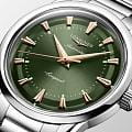 Циферблат глубокого зелёного оттенка оформлен с сатинированной отделкой «солнечные лучи» и украшен накладными индексами и стрелками с покрытием Swiss Super‑LumiNova. Для защиты от повреждений и чёткого отображения показаний используется куполообразное сапфировое стеклоСапфировое стеклоПрочный и надёжный материал из кристалла сапфира синтетического происхождения, характеризующийся особой твёрдостью и устойчивостью к царапинам и повреждениям. с антибликовым покрытием.
