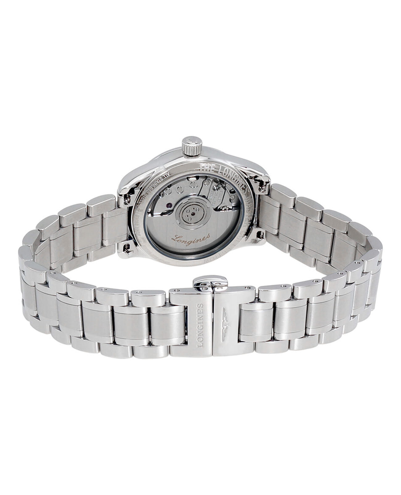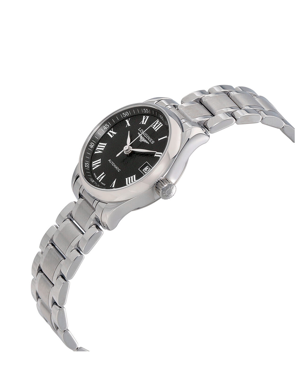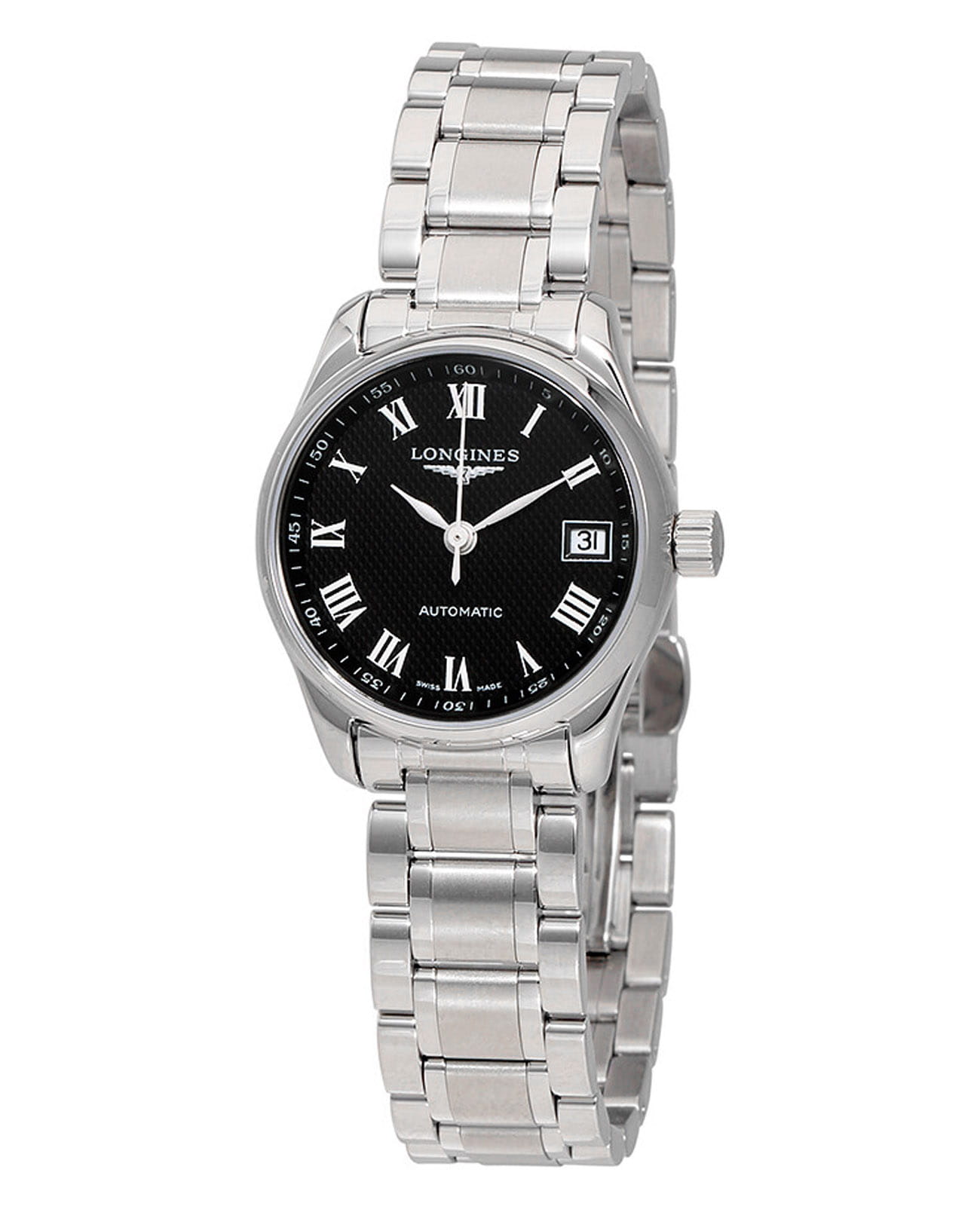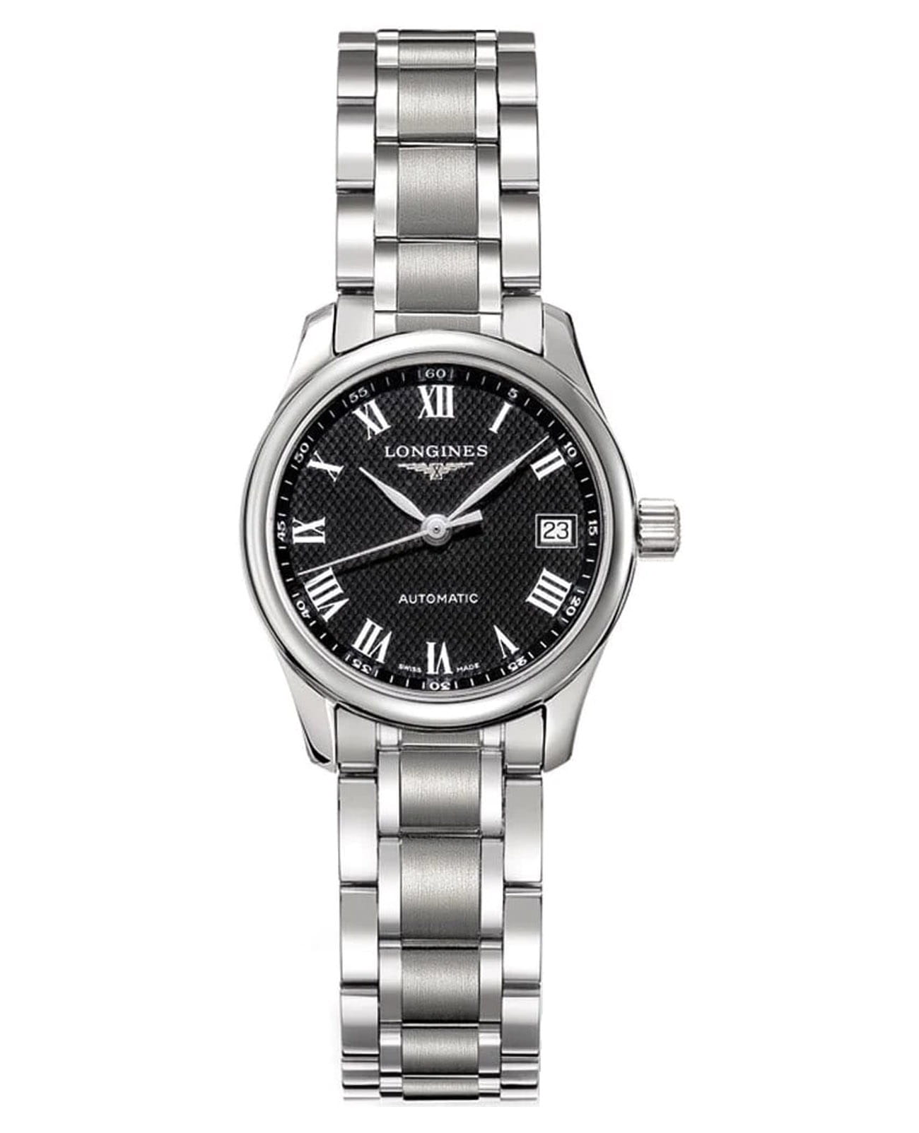 Женские швейцарские механические часы с автоподзаводом Longines Master Collection L2.128.4.51.6. Сапфировое стеклоСапфировое стеклоПрочный и надёжный материал из кристалла сапфира синтетического происхождения, характеризующийся особой твёрдостью и устойчивостью к царапинам и повреждениям. устойчивое к появлению царапин, обладающее высокой прозрачностью. Корпус часов изготовлен из нержавеющей стали. Циферблат украшен черным гильоше. Окошко даты в положении 3 часов. Прозрачная задняя крышка. Класс водозащиты: 30 метров, позволит защитить корпус от случайных брызг или капель дождя. Стальной браслет на застёжке «бабочка» с кнопкамиЗастёжка "бабочка"Такой вид застёжки дополняется предохранителями, помогающими избежать случайного раскрытия браслета. Обладают изящным исполнением. .