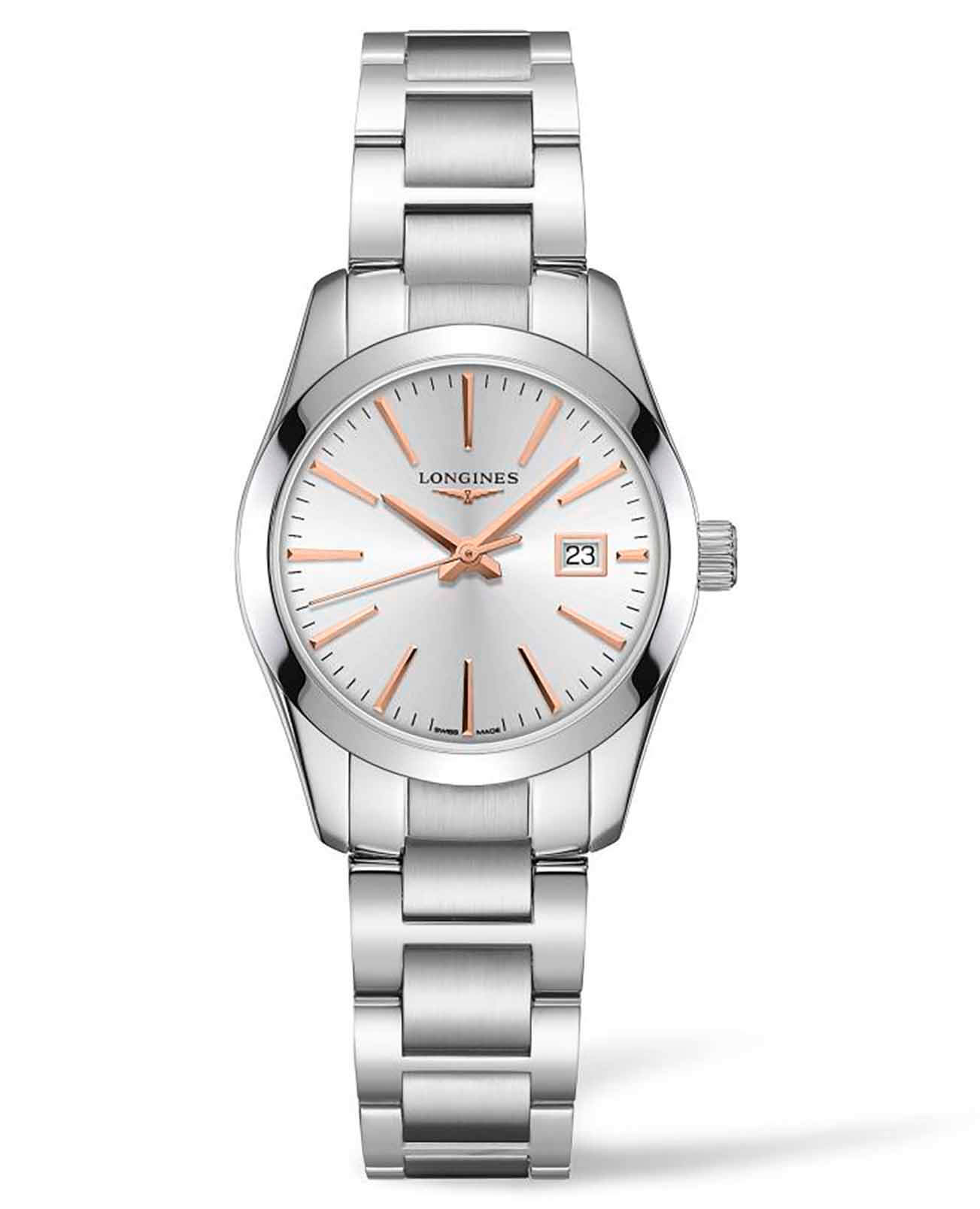 Женские швейцарские часы Longines Conquest Classic L2.286.4.72.6 – это изысканный аксессуар, способный придать вашему деловому образу особую элегантность и утонченность. Их сапфировое стеклоСапфировое стеклоПрочный и надёжный материал из кристалла сапфира синтетического происхождения, характеризующийся особой твёрдостью и устойчивостью к царапинам и повреждениям. с антибликовым покрытием не только защищает циферблат от повреждений, но и сохраняет его кристальную чистоту даже в ярком свете.