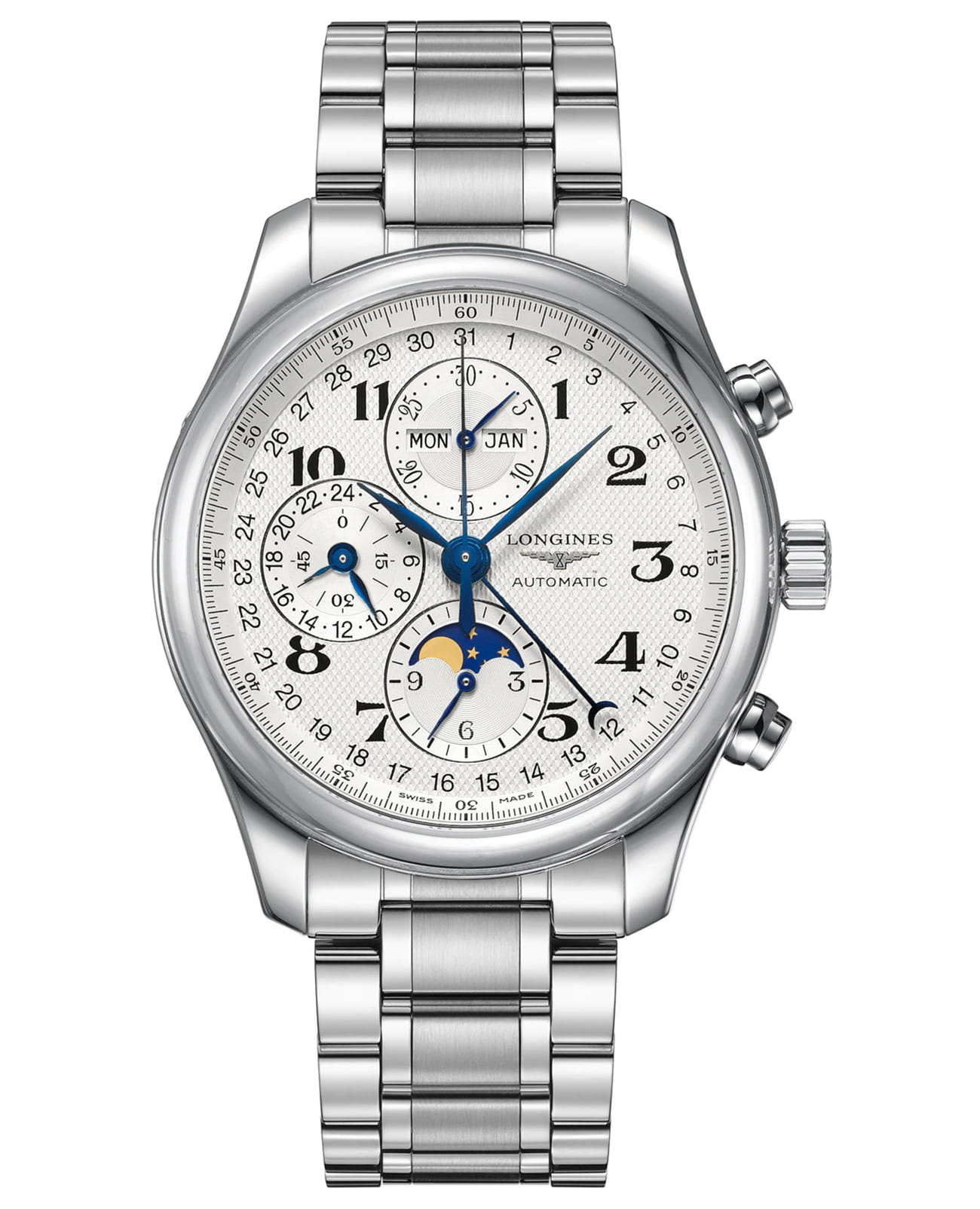 Мужские швейцарские механические часы-хронографХронографФункция позволяет измерять отрезки времени с особой точностью: часы, минуты, секунды. Верным признаком хронографа является наличие на циферблате 3 дополнительных окошек-счётчиков. с автоподзаводом Longines Master Collection L2.773.4.78.6. Сапфировое стеклоСапфировое стеклоПрочный и надёжный материал из кристалла сапфира синтетического происхождения, характеризующийся особой твёрдостью и устойчивостью к царапинам и повреждениям. устойчивое к появлению царапин, обладающее высокой прозрачностью. Корпус часов изготовлен из нержавеющей стали. Автоматический механизм с частотой баланса 28 800 полуколебаний в час и запасом хода, которого хватает примерно на 66 часов работы. Часы, минуты, малая секундная стрелка с 24-часовым индикатором в положении «9 часов». Дату показывает центральная стрелка с серповидным наконечником. Указатель фаз Луны в положении «6 часов». Класс водозащиты: 30 метров, позволит защитить корпус от случайных брызг или капель дождя. Стальной браслет на застёжке «бабочка» с кнопкамиЗастёжка "бабочка"Такой вид застёжки дополняется предохранителями, помогающими избежать случайного раскрытия браслета. Обладают изящным исполнением. .