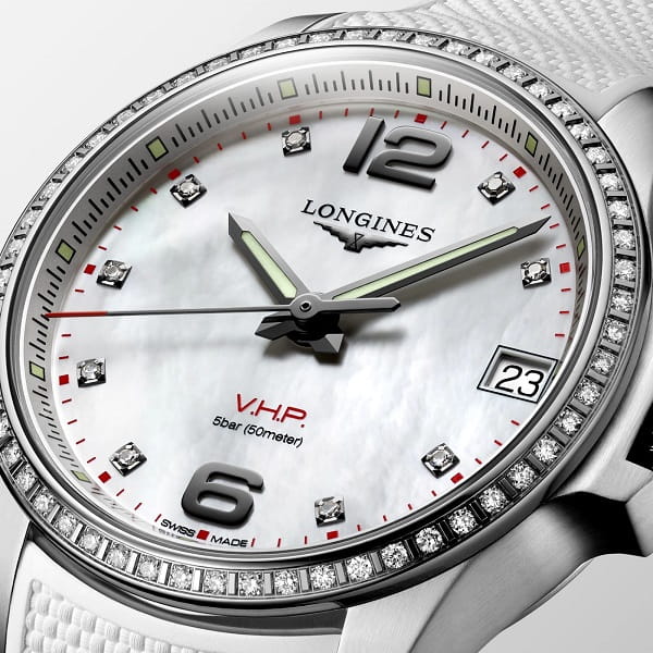 Элегантная модель с перламутровым циферблатом дополнена бриллиантовыми метками, общий вес драгоценных камней – 0,041 карат. Роскошный безельБезельВнешний ободок, закрепляющий стекло. В спортивных часах так называется поворотное кольцо с делениями на циферблате, выполняет роль таймера – замеряет отрезки времени на шкале. Неподвижный безель – элемент декора. Однонаправленно вращающийся безель на дайверских часах позволяет фиксировать моменты погружения и выныривания на поверхность. инкрустирован 56 бриллиантами в 0,381 карат. Кварцевый швейцарский калибр L288 отличается высокой точностью хода, о чём свидетельствует маркировка V.H.P. Функции: , индикатор EOLEOLПредставляет собой систему, уведомляющую владельца часов о необходимости замены элемента питания. За 2 недели до полного разряда батарейки секундная стрелка перестаёт ходить чётко и начинает перепрыгивать на 3-4 деления..
