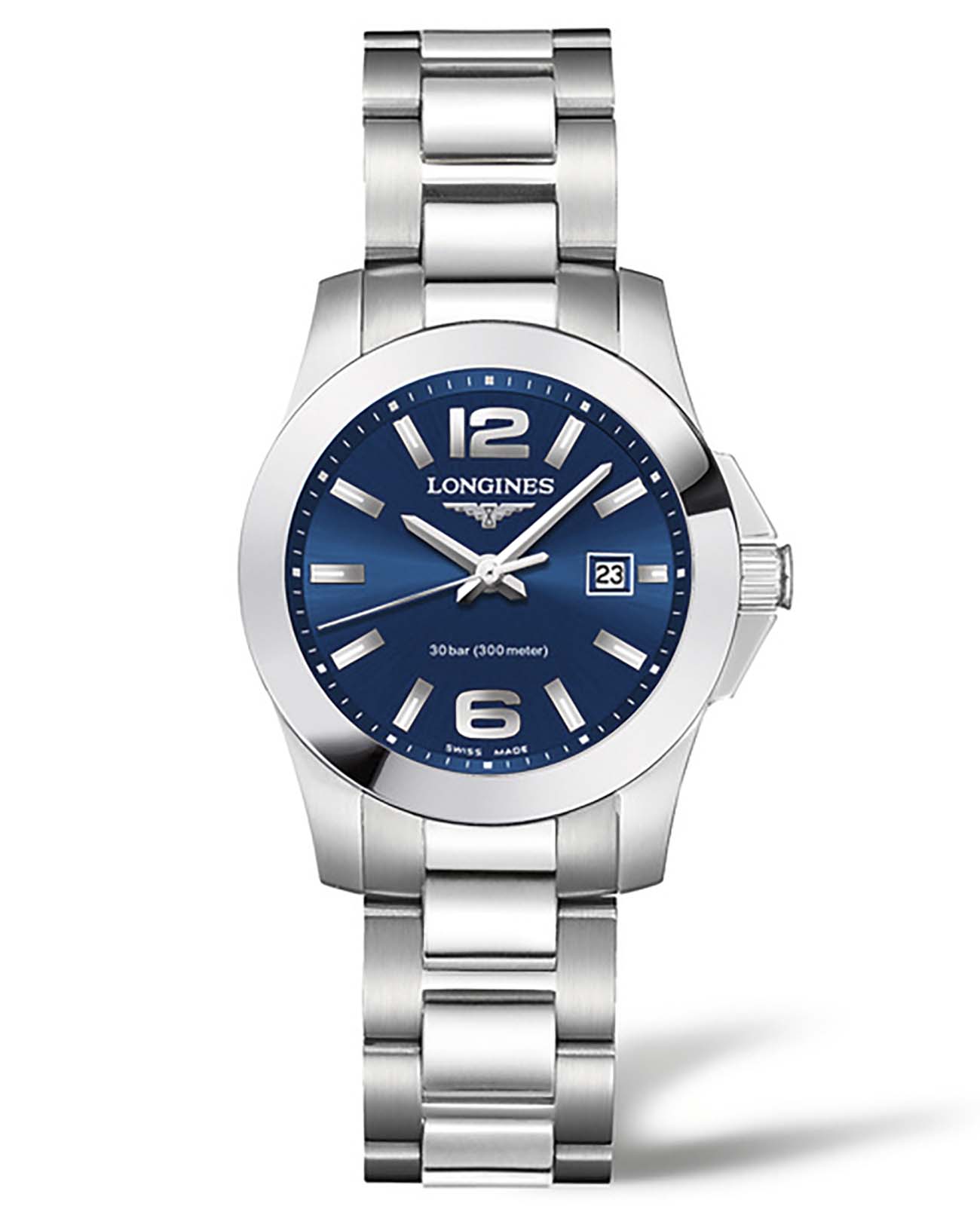 Часы Longines Conquest (артикул L33764966) сочетают в себе спортивную элегантность и функциональность, характерные для коллекции Conquest. Корпус диаметром 29,5 мм выполнен из нержавеющей стали с водозащитой до 30 бар (300 метров). Завинчивающаяся заводная головка и задняя крышка подчёркивают практичность. Синий циферблат с солнечным узором оснащён накладными арабскими цифрами и индексами, стрелками с люминесцентным покрытиемЛюминесцентное покрытиеПозволяет считывать показания времени в темноте. Производители наносят на стрелки, часовые индексы, безель или поверхность циферблата светонакопительный состав, дающий холодное свечение., а также окошком даты в положении «3 часа». Циферблат защищён сапфировым стекломСапфировое стеклоПрочный и надёжный материал из кристалла сапфира синтетического происхождения, характеризующийся особой твёрдостью и устойчивостью к царапинам и повреждениям. с антибликовым покрытием.