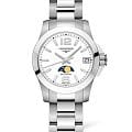 Женские швейцарские часы Longines Conquest L3.380.4.16.6 станут элегантным дополнением образа. Компактный циферблат защищён от царапин сапфировым стеклом с антибликовой обработкойАнтибликовое покрытиеСлой оксида металла в 0,13-0,3 микрон, благодаря которому стекло часов не бликует и не отражает свет. Антибликовое покрытие уменьшает отражение света в 10 раз, обеспечивая отличную читаемость показателей циферблата.. Сохранять водостойкость до 30 бар помогают закручивающаяся задняя крышка и завинчивающаяся заводная головка. Швейцарский кварцевый калибр L296 обеспечивает высокую точность хода. Дополнительные усложнения: календарь, индикатор EOLEOLПредставляет собой систему, уведомляющую владельца часов о необходимости замены элемента питания. За 2 недели до полного разряда батарейки секундная стрелка перестаёт ходить чётко и начинает перепрыгивать на 3-4 деления., отображение фаз луны.
