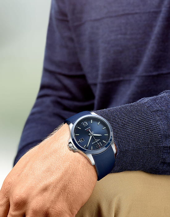 Синий ремешок из каучука стильно смотрится на запястье. Швейцарский кварцевый механизм L288 демонстрирует абсолютную точность хода. Сапфировое стекло имеет антибликовое покрытиеАнтибликовое покрытиеСлой оксида металла в 0,13-0,3 микрон, благодаря которому стекло часов не бликует и не отражает свет. Антибликовое покрытие уменьшает отражение света в 10 раз, обеспечивая отличную читаемость показателей циферблата.. Функции: вечный календарь, индикатор EOLEOLПредставляет собой систему, уведомляющую владельца часов о необходимости замены элемента питания. За 2 недели до полного разряда батарейки секундная стрелка перестаёт ходить чётко и начинает перепрыгивать на 3-4 деления..