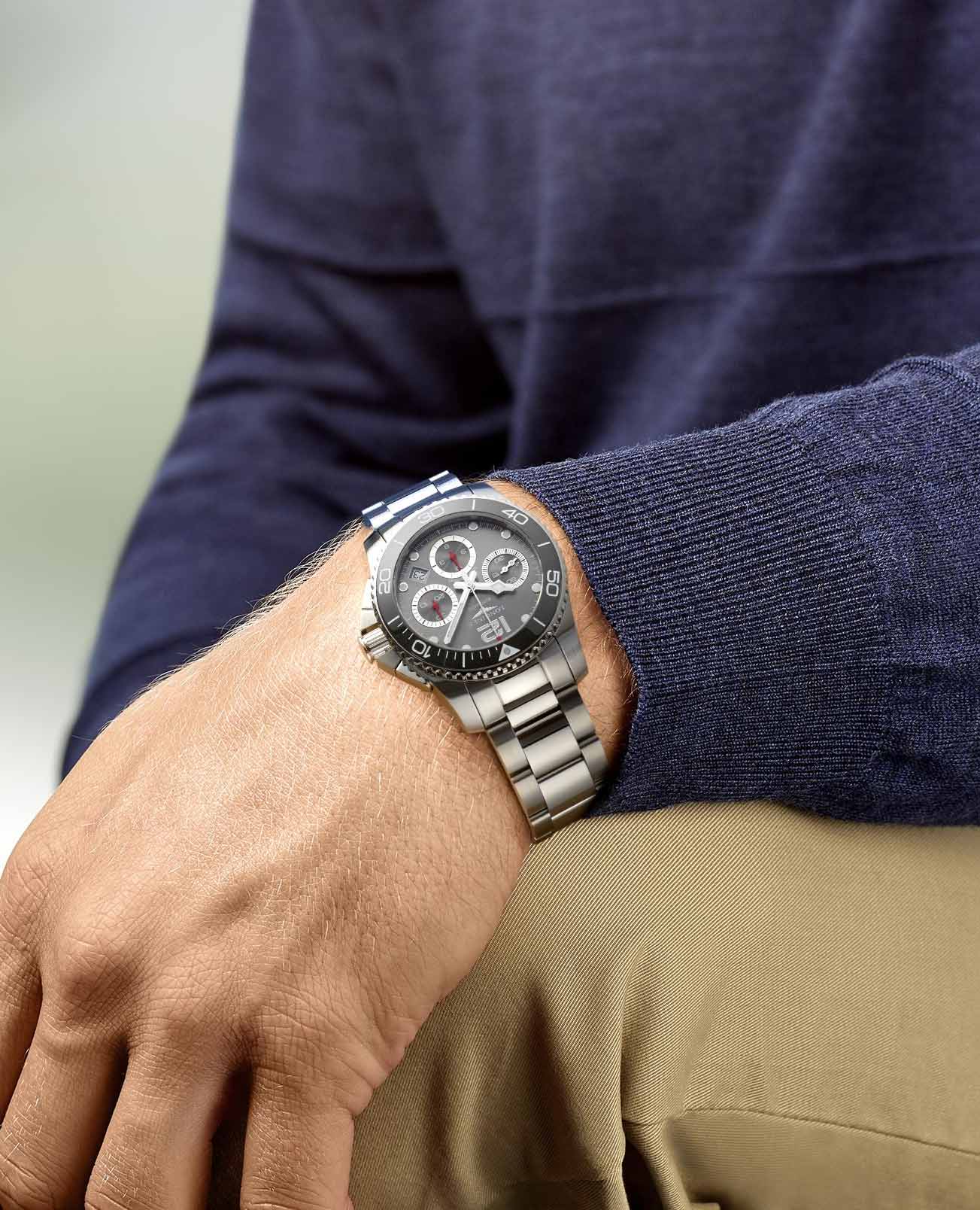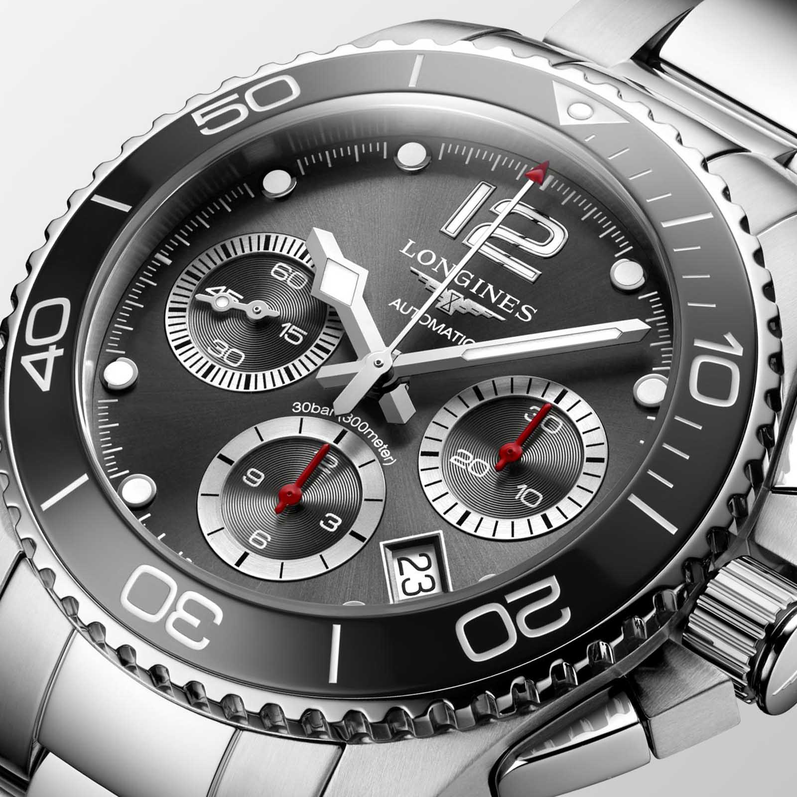 Керамический серый безельБезельВнешний ободок, закрепляющий стекло. В спортивных часах так называется поворотное кольцо с делениями на циферблате, выполняет роль таймера – замеряет отрезки времени на шкале. Неподвижный безель – элемент декора. Однонаправленно вращающийся безель на дайверских часах позволяет фиксировать моменты погружения и выныривания на поверхность. идеально сочетается с корпусом из стали 316L. Швейцарский автоматический механизм L688 характеризуется запасом хода на 54 часа и обеспечивает высокую точность показателей. Сапфировое стекло дополнено многослойным антибликовым покрытиемАнтибликовое покрытиеСлой оксида металла в 0,13-0,3 микрон, благодаря которому стекло часов не бликует и не отражает свет. Антибликовое покрытие уменьшает отражение света в 10 раз, обеспечивая отличную читаемость показателей циферблата.. Особенности: люминесцентная подсветкаЛюминесцентное покрытиеПозволяет считывать показания времени в темноте. Производители наносят на стрелки, часовые индексы, безель или поверхность циферблата светонакопительный состав, дающий холодное свечение., календарь, хронографХронографФункция позволяет измерять отрезки времени с особой точностью: часы, минуты, секунды. Верным признаком хронографа является наличие на циферблате 3 дополнительных окошек-счётчиков..
