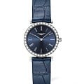 Компактный синий циферблат украшен 36 бриллиантами общим весом 0.302 карата. Элегантным дополнением стал ремешок из кожи аллигатора. Швейцарский кварцевый калибр L209 обеспечивает высокую точность хода. Сапфировое стекло не допускает появления царапин на поверхности.