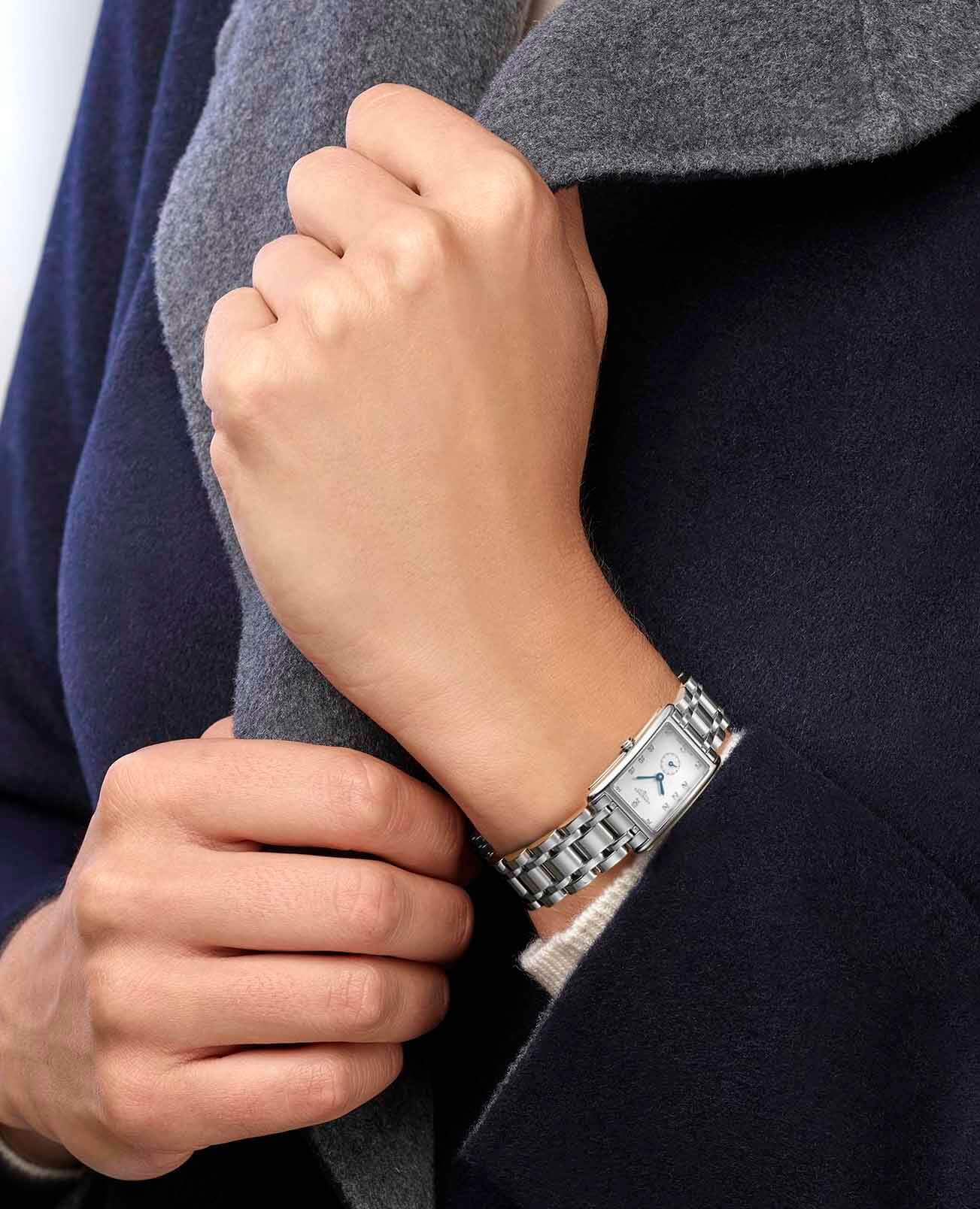 Изящная модель с белым перламутровым циферблатом инкрустирована 13 бриллиантами весом 0.059 карата. Браслет выполнен из нержавеющей стали 316L. Швейцарский кварцевый калибр L178 обеспечивает высокую точность хода. Сапфировое стекло устойчиво к царапинам. Наручные часы оснащены индикатором EOLEOLПредставляет собой систему, уведомляющую владельца часов о необходимости замены элемента питания. За 2 недели до полного разряда батарейки секундная стрелка перестаёт ходить чётко и начинает перепрыгивать на 3-4 деления..