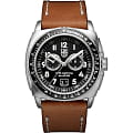 Эффектные швейцарские часы. Часы с секундомером и тахиметром. Безел ь вращается в одном направлении. Завинчивающаяся заводная головка с защитой. Завинчивающаяся задняя крышка с гравировкой истребителя времен Второй мировой войны P-38 Lightning. Материал корпуса: сталь 316L с частичным PVD покрытием; Материал браслета: кожаный ремешок; Стекло: Сапфировое; Водозащита: 200 м. (WR 200).