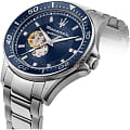 Механический механизм (автоматический калибр) с высокой точностью. Сапфировое стеклоСапфировое стеклоПрочный и надёжный материал из кристалла сапфира синтетического происхождения, характеризующийся особой твёрдостью и устойчивостью к царапинам и повреждениям. устойчивое к появлению царапин, обладающее высокой прозрачностью. Циферблат украшен бриллиантами. Стрелки с люминесцентным покрытиемЛюминесцентное покрытиеПозволяет считывать показания времени в темноте. Производители наносят на стрелки, часовые индексы, безель или поверхность циферблата светонакопительный состав, дающий холодное свечение.. БезельБезельВнешний ободок, закрепляющий стекло. В спортивных часах так называется поворотное кольцо с делениями на циферблате, выполняет роль таймера – замеряет отрезки времени на шкале. Неподвижный безель – элемент декора. Однонаправленно вращающийся безель на дайверских часах позволяет фиксировать моменты погружения и выныривания на поверхность. поворотный. Класс водозащиты: 100 метров, позволит плавать, нырять и заниматься другими водными видами спорта. Корпус часов изготовлен из нержавеющей стали. Браслет с застёжкой «бабочка» с кнопкамиЗастёжка "бабочка"Такой вид застёжки дополняется предохранителями, помогающими избежать случайного раскрытия браслета. Обладают изящным исполнением. . Дополнительный ремешок в комплекте.