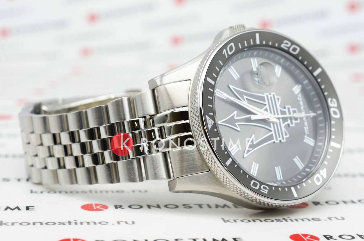 Модель Maserati Sfida R8853140010 — воплощение стиля и функциональности для современных мужчин, ценящих качество и элегантность. Корпус диаметром 44 мм выполнен из нержавеющей стали, обеспечивая прочность и долговечность. Минеральное стеклоМинеральное стеклоМинеральное стекло представляет собой искусственно выращенный минерал кварца. Такое стекло отличается особой устойчивостью к повреждениям и царапинам. Уступает по некоторым качествам сапфировому стеклу. надежно защищает синий циферблат с изящными рисками, придавая часам утонченный вид. Благодаря водостойкости до 100 метров (10 АТМ), эти часы станут вашим надежным спутником в любых условиях, будь то деловая встреча или активный отдых. Люминесцентное покрытиеЛюминесцентное покрытиеПозволяет считывать показания времени в темноте. Производители наносят на стрелки, часовые индексы, безель или поверхность циферблата светонакопительный состав, дающий холодное свечение. на стрелках и метках обеспечивает отличную видимость в темноте. Завершающий штрих — стальной браслет с раскладной застёжкойРаскладная застёжкаТакой тип застёжки используется только на браслетах из металла. Она никогда не раскрывается полностью, происходит разделение на 2 и более частей. Раскладывающая застёжка снизит вероятность потери часов к минимуму., который подчеркивает общий стиль, обеспечивая комфорт и надежность в носке. Вращающийся стальной безельБезельВнешний ободок, закрепляющий стекло. В спортивных часах так называется поворотное кольцо с делениями на циферблате, выполняет роль таймера – замеряет отрезки времени на шкале. Неподвижный безель – элемент декора. Однонаправленно вращающийся безель на дайверских часах позволяет фиксировать моменты погружения и выныривания на поверхность. с IP-покрытиемIP-покрытиеМетод ионного напыления. Демонстрирует повышенную устойчивость к истиранию, окислению и химическим веществам. Под воздействием высокого давления и температуры около 1500°C молекулы металла надёжно соединяются с частицами корпуса часов.. Циферблат выполнен по технологии Sunray (солнечные лучи) и украшен фирменным логотипом «Maserati». Метки в виде штрихов. Окошко даты с увеличительным стеклом находится в положении 3 часа.