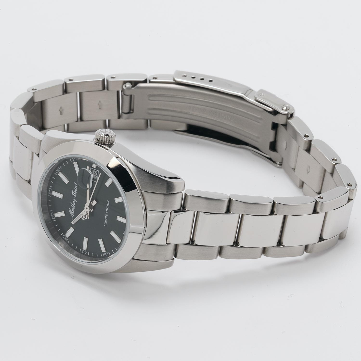 Женские кварцевые часы Mathey-Tissot Mathy D451VE — это стильное сочетание элегантности и современного дизайна. Лимитированная серия. Изящный корпус выполнен из нержавеющей стали, диаметром 32 мм, что придаст образу женственности и романтизма. Изысканный циферблат с метками в виде штрихов придает модели особый блеск. Циферблат защищен минеральным стекломМинеральное стеклоМинеральное стекло представляет собой искусственно выращенный минерал кварца. Такое стекло отличается особой устойчивостью к повреждениям и царапинам. Уступает по некоторым качествам сапфировому стеклу., обеспечивающий устойчивость к царапинам. Стрелки и метки с люминесцентным покрытиемЛюминесцентное покрытиеПозволяет считывать показания времени в темноте. Производители наносят на стрелки, часовые индексы, безель или поверхность циферблата светонакопительный состав, дающий холодное свечение.. Окошко даты находится в положении 3 часа. Часы оснащены надежным кварцевым механизмом. Стальной браслет на раскладной застёжке с фиксаторомРаскладная застёжкаТакой тип застёжки используется только на браслетах из металла. Она никогда не раскрывается полностью, происходит разделение на 2 и более частей. Раскладывающая застёжка снизит вероятность потери часов к минимуму., гарантирует комфортное и безопасное ношение. Класс водозащиты: 50 метров позволит защитить корпус от случайных брызг или капель дождя. Mathey-Tissot  — отличный выбор для тех, кто ценит утонченность и качество.