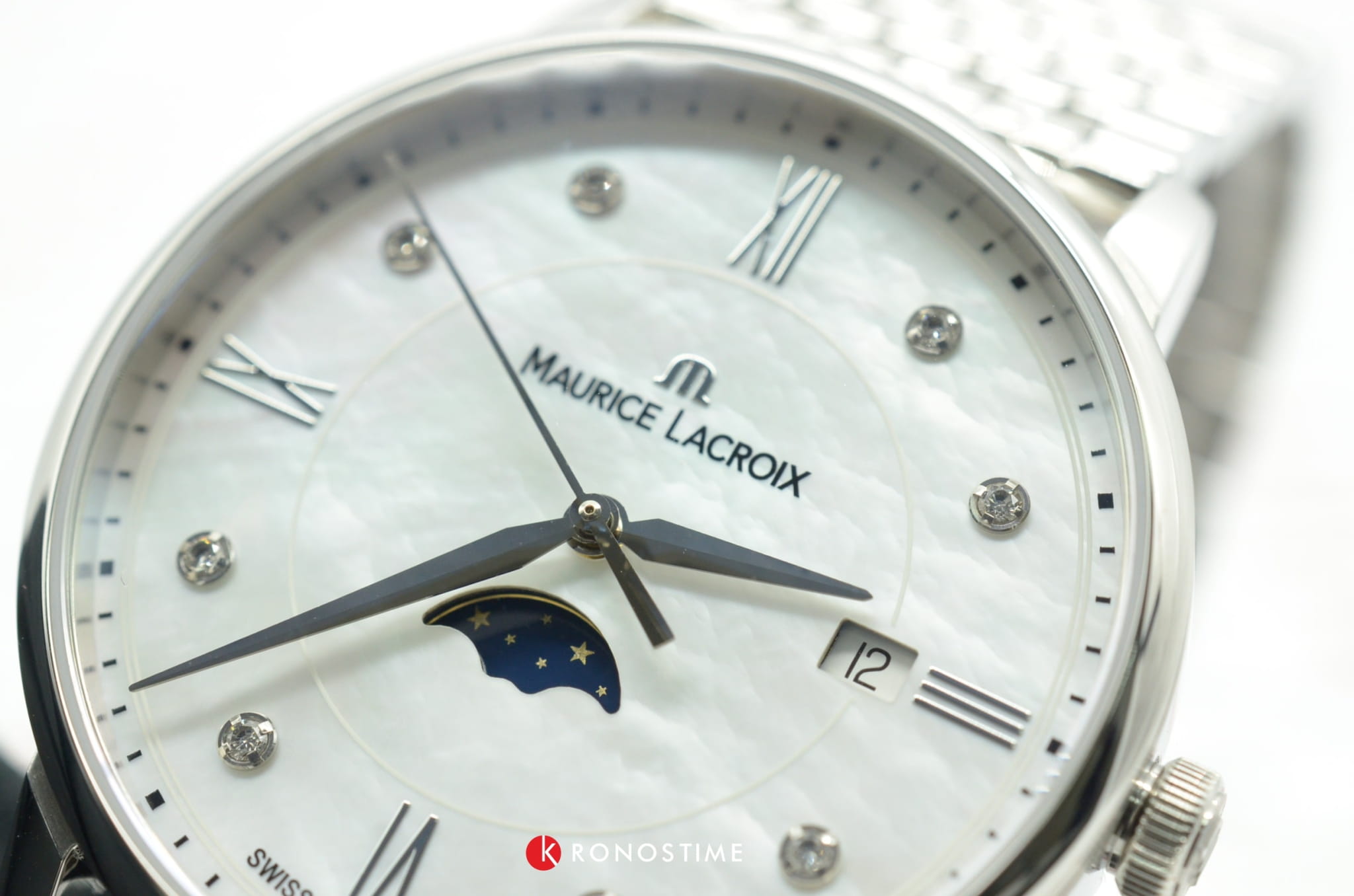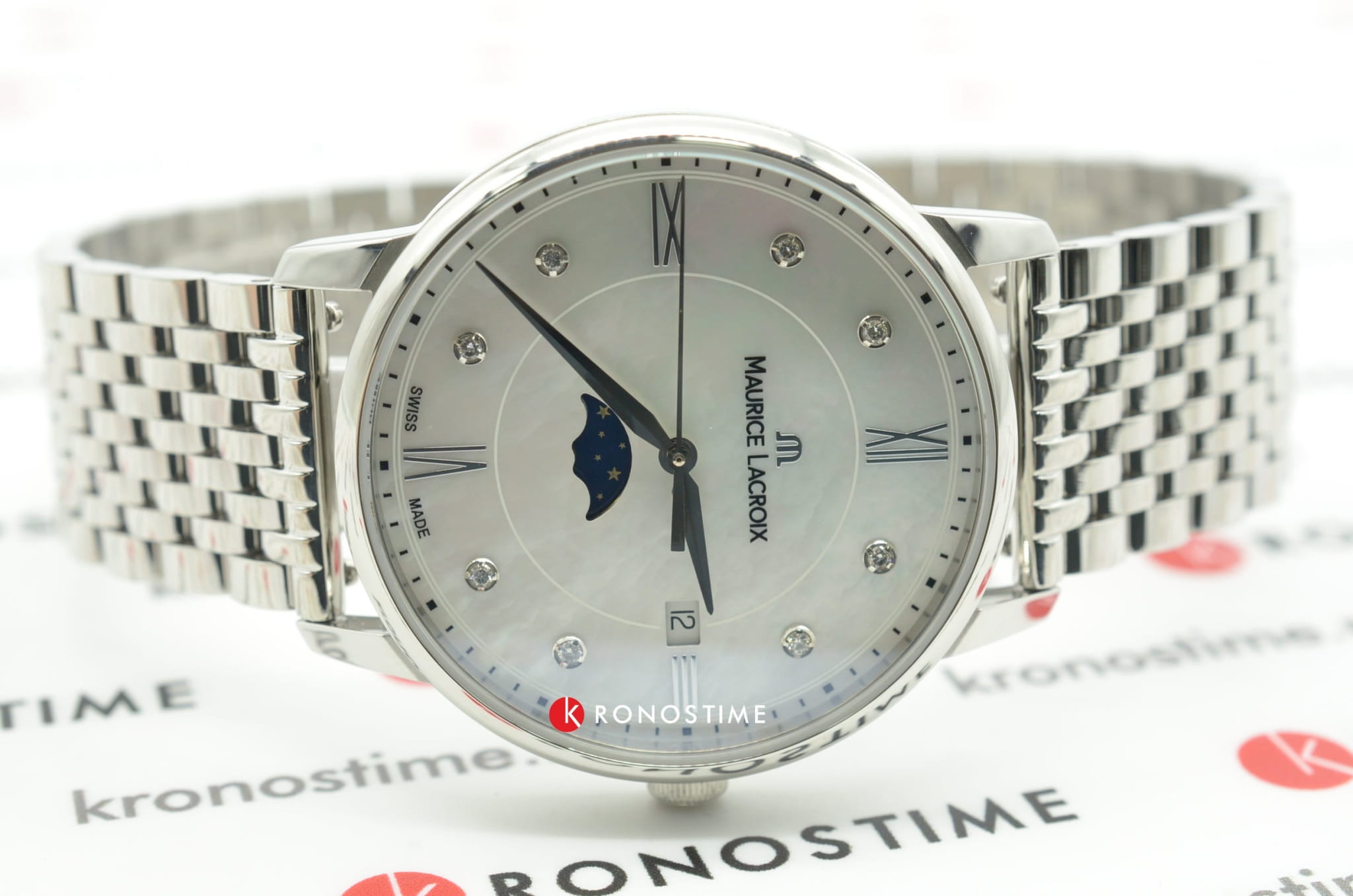 Женские швейцарские часы с лунным календарем Maurice Lacroix Eliros Moonphase EL1096-SS002-170-1, кварцевый механизм с высокой точностью. Сапфировое стекло устойчивое к появлению царапин, обладающее высокой прозрачностью. Класс водозащиты: 50 метров, позволит защитить корпус от случайных брызг или капель дождя. Корпус часов изготовлен из стали, цвета.