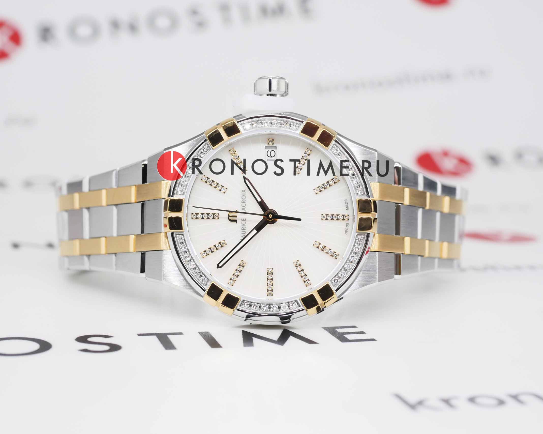 Мужские швейцарские кварцевые часы Maurice Lacroix Aikon Quartz AI1106-PVPD2-170-1. Сапфировое стеклоСапфировое стеклоПрочный и надёжный материал из кристалла сапфира синтетического происхождения, характеризующийся особой твёрдостью и устойчивостью к царапинам и повреждениям. устойчивое к появлению царапин, обладающее высокой прозрачностью. Перламутровый циферблат. Стрелки с люминесцентным покрытиемЛюминесцентное покрытиеПозволяет считывать показания времени в темноте. Производители наносят на стрелки, часовые индексы, безель или поверхность циферблата светонакопительный состав, дающий холодное свечение.. Метки на циферблате и безельБезельВнешний ободок, закрепляющий стекло. В спортивных часах так называется поворотное кольцо с делениями на циферблате, выполняет роль таймера – замеряет отрезки времени на шкале. Неподвижный безель – элемент декора. Однонаправленно вращающийся безель на дайверских часах позволяет фиксировать моменты погружения и выныривания на поверхность. украшены бриллиантами. Класс водозащиты: 100 метров, позволит плавать, нырять и заниматься другими водными видами спорта. Окошко даты находится в положении 3 часов. Корпус и браслет часов изготовлены из стали с частичным PVD-покрытиемPVDУльтратонкое покрытие наносится в технике вакуумного напыления, сочетает в себе нитрид титана особой прочности со слоем золота или оксида хрома. Несёт в себе декоративную или защитную функцию.. Браслет с застёжкой «бабочка» с кнопкамиЗастёжка "бабочка"Такой вид застёжки дополняется предохранителями, помогающими избежать случайного раскрытия браслета. Обладают изящным исполнением. .