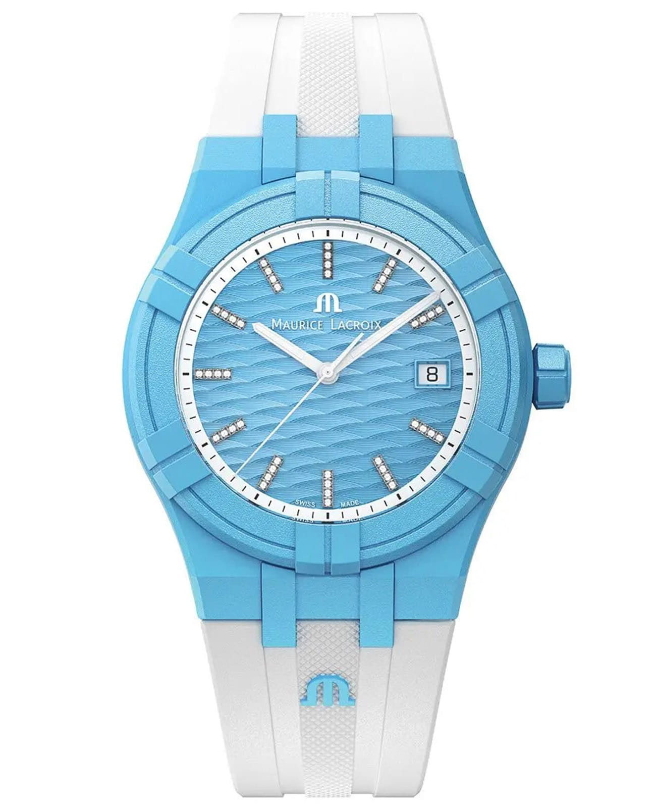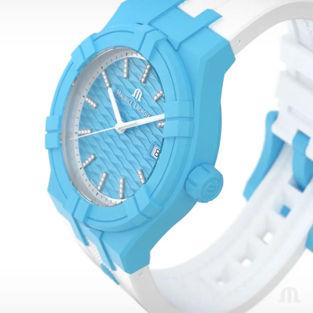 Часы AIKON #tide обладают всеми преимуществами AIKON, но кроме того, они выполнены из особого материала под названием #tideocean – переработанного океанского пластика, усиленного стекловолокном. В результате сложного технологического процесса переработки получен композитный материал, вдвое превосходящий по прочности обычный пластик. Износостойкость композита #tideocean в пять раз выше полиэтилентерефталата (ПЭТ). И еще немаловажный экологический фактор – в процессе превращения океанского пластика в материал #tideocean углеродные выбросы в атмосферу значительно снижаются, чем при обычном процессе выпуска первичного пластика. В новой модели безельБезельВнешний ободок, закрепляющий стекло. В спортивных часах так называется поворотное кольцо с делениями на циферблате, выполняет роль таймера – замеряет отрезки времени на шкале. Неподвижный безель – элемент декора. Однонаправленно вращающийся безель на дайверских часах позволяет фиксировать моменты погружения и выныривания на поверхность., корпус, задняя крышка, заводная головка, наконечник и застежка выполнены из композитного материала #tideocean. 17 пластиковых бутылок требуется для производства одних отличных часов и их специальной упаковки, также на 100% состоящей из материала #tide, появившегося в результате отходов пластика в океане. В результате такой переработки выигрывают все. Унисекс швейцарские кварцевые часы Maurice Lacroix Aikon Quartz AI2008-AAAA1-3A0-0. Сапфировое стеклоСапфировое стеклоПрочный и надёжный материал из кристалла сапфира синтетического происхождения, характеризующийся особой твёрдостью и устойчивостью к царапинам и повреждениям. устойчивое к появлению царапин, обладающее высокой прозрачностью. Голубой циферблат. Стрелки и метки с люминесцентным покрытиемЛюминесцентное покрытиеПозволяет считывать показания времени в темноте. Производители наносят на стрелки, часовые индексы, безель или поверхность циферблата светонакопительный состав, дающий холодное свечение.. Класс водозащиты: 100 метров, позволит плавать, нырять и заниматься другими водными видами спорта. Окошко даты находится в положении 3 часов. Циферблат с тематическим гильошированием "Vagues du Jura". Корпус выполнен из переработанного пластика, ранее загрязнявшего Мировой океан. Каучуковый ремешок с классической застежкой.