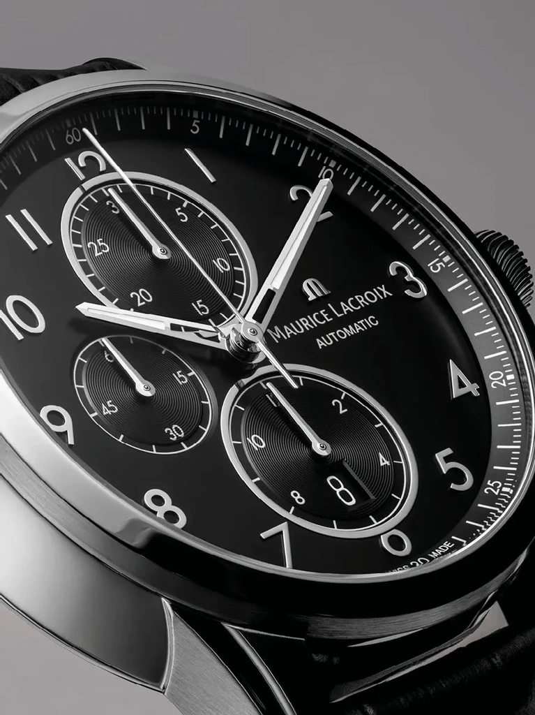 Мужские швейцарские механические часы c хронографомХронографФункция позволяет измерять отрезки времени с особой точностью: часы, минуты, секунды. Верным признаком хронографа является наличие на циферблате 3 дополнительных окошек-счётчиков. Maurice Lacroix Pontos Chronograph PT6388-SS001-320-2, механический механизм (автоматический калибр) с высокой точностью. Сапфировое стеклоСапфировое стеклоПрочный и надёжный материал из кристалла сапфира синтетического происхождения, характеризующийся особой твёрдостью и устойчивостью к царапинам и повреждениям. устойчивое к появлению царапин, обладающее высокой прозрачностью. Класс водозащиты: 100 метров, позволит плавать, нырять и заниматься другими водными видами спорта. Корпус часов изготовлен из стали. Стрелки с люминесцентным покрытиемЛюминесцентное покрытиеПозволяет считывать показания времени в темноте. Производители наносят на стрелки, часовые индексы, безель или поверхность циферблата светонакопительный состав, дающий холодное свечение.. Кожаный ремешок на застёжке «бабочка» с кнопкамиЗастёжка "бабочка"Такой вид застёжки дополняется предохранителями, помогающими избежать случайного раскрытия браслета. Обладают изящным исполнением. . СекундомерСекундомерСекундоме́р — прибор, способный измерять интервалы времени с точностью до долей секунды.. Окошко даты находится в положении 6 часов.