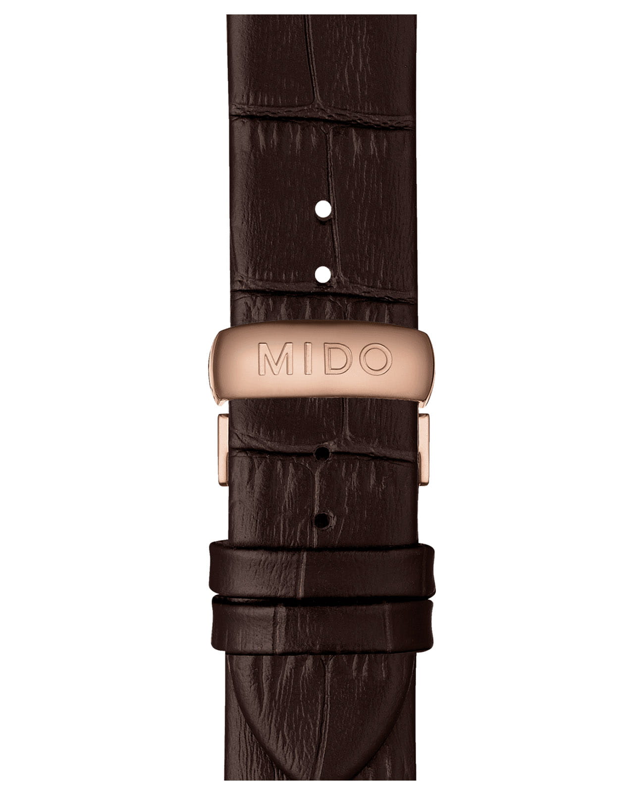 Модель оснащена автоматическим механизмом Mido Caliber 80 Big Date с запасом хода до 80 часов, что обеспечивает надёжность и точность. Крупное окно даты, расположенное над отметкой 6 часов, делает модель особенно удобной для считывания информации.