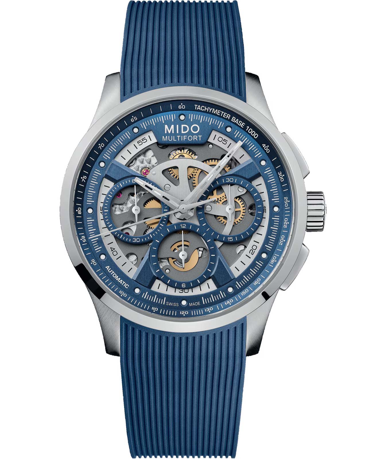 Швейцарские мужские наручные часы Mido Multifort Skeleton Chronograph M038.662.17.040.00, механический механизм с высокой точностью. Циферблат c сапфировым стекломСапфировое стеклоПрочный и надёжный материал из кристалла сапфира синтетического происхождения, характеризующийся особой твёрдостью и устойчивостью к царапинам и повреждениям., устойчивым к появлению царапин и обладающее высокой прозрачностью. Класс водозащиты: 100 метров, позволит плавать, нырять и заниматься другими водными видами спорта. Часы оснащены люминесцентным покрытиемЛюминесцентное покрытиеПозволяет считывать показания времени в темноте. Производители наносят на стрелки, часовые индексы, безель или поверхность циферблата светонакопительный состав, дающий холодное свечение., обеспечивающим отличную видимость даже при слабом освещении. Корпус часов изготовлен из стали. Часы с балансом из Nivachron™Nivachron™Специально разработанный инновационный сплав Nivachron™ повышает устойчивость часов к воздействию магнитных полей., обеспечивающим высокую устойчивость к магнитным полям и ударам. Часы с функциями хронографаХронографФункция позволяет измерять отрезки времени с особой точностью: часы, минуты, секунды. Верным признаком хронографа является наличие на циферблате 3 дополнительных окошек-счётчиков. и тахиметраТахиметрРазмеченная шкала, располагается на ободке или безеле часов. Тахиметр позволяет рассчитать скорость на определённом участке пути, расстояние измеряется в километрах или милях.. Каучуковый ремешок синего цвета со стандартной застежкой обеспечивает комфортное ношение.