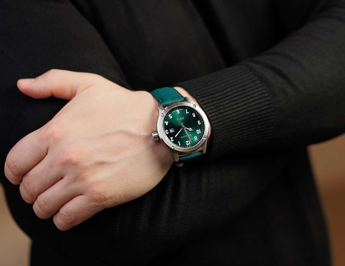 Мужские механические часы с автоподзаводом — это надёжный аксессуар от легендарного бренда «МОЛНИЯ», созданного на Челябинском часовом заводе. Корпус диаметром 44 мм и высотой 12 мм выполнен из нержавеющей стали 316L с матовой полировкой. БезельБезельВнешний ободок, закрепляющий стекло. В спортивных часах так называется поворотное кольцо с делениями на циферблате, выполняет роль таймера – замеряет отрезки времени на шкале. Неподвижный безель – элемент декора. Однонаправленно вращающийся безель на дайверских часах позволяет фиксировать моменты погружения и выныривания на поверхность. также выполнен из стали с матовой отделкой. Циферблат зелёного цвета матовый, оформлен стрелками и индексами с люминесцентным покрытиемЛюминесцентное покрытиеПозволяет считывать показания времени в темноте. Производители наносят на стрелки, часовые индексы, безель или поверхность циферблата светонакопительный состав, дающий холодное свечение. Super-LumiNova. Окошко даты расположено в положении 3 часов. Циферблат защищён сапфировым стекломСапфировое стеклоПрочный и надёжный материал из кристалла сапфира синтетического происхождения, характеризующийся особой твёрдостью и устойчивостью к царапинам и повреждениям. толщиной 1,5 мм. Механизм — японский автоматический калибр Miyota 8215 с функцией и запасом хода 42 часа. Часы оснащены кожаным ремешком зелёного цвета шириной 22 мм с классической пряжкой. Водонепроницаемость 100 м позволяет использовать часы для плавания и повседневного ношения. Идеальный выбор для тех, кто ценит российское качество и мужественный дизайн.