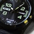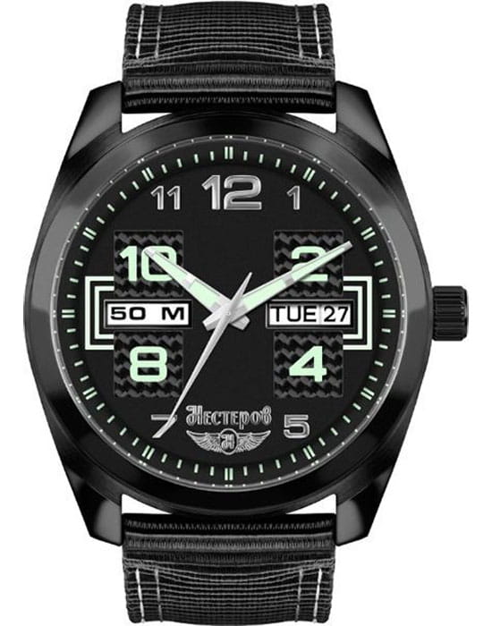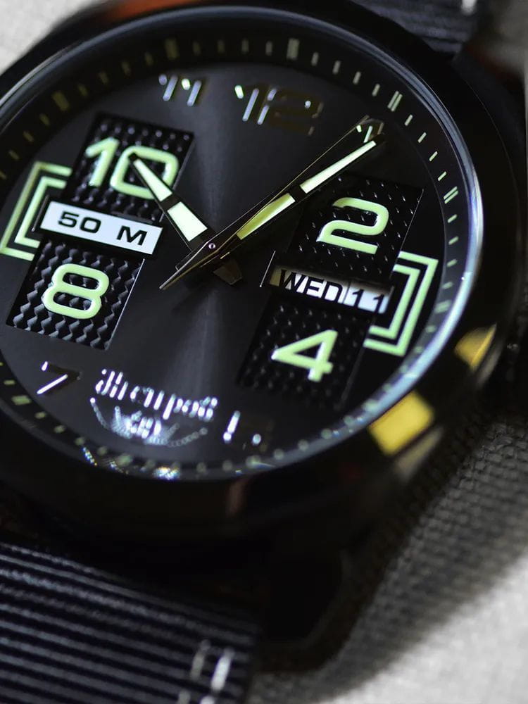 Ремешок выполнен из прочного текстиля чёрного цвета, обеспечивая комфорт при носке и добавляя модели спортивный характер. Толщина корпуса составляет 12 мм, что придаёт часам солидный вид.