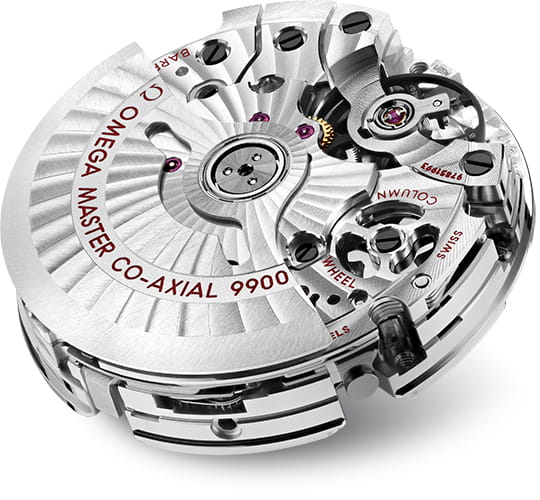 в форме стрел, покрытыми Super-LumiNovaЛюминесцентное покрытиеПозволяет считывать показания времени в темноте. Производители наносят на стрелки, часовые индексы, безель или поверхность циферблата светонакопительный состав, дающий холодное свечение., и двумя счетчиками с чернеными кольцами. Оранжево-белые стрелки и окошко даты на 6 часах завершают образ. Механизм — калибр OMEGA Co-Axial Master Chronometer 9900, сертифицированный METAS.