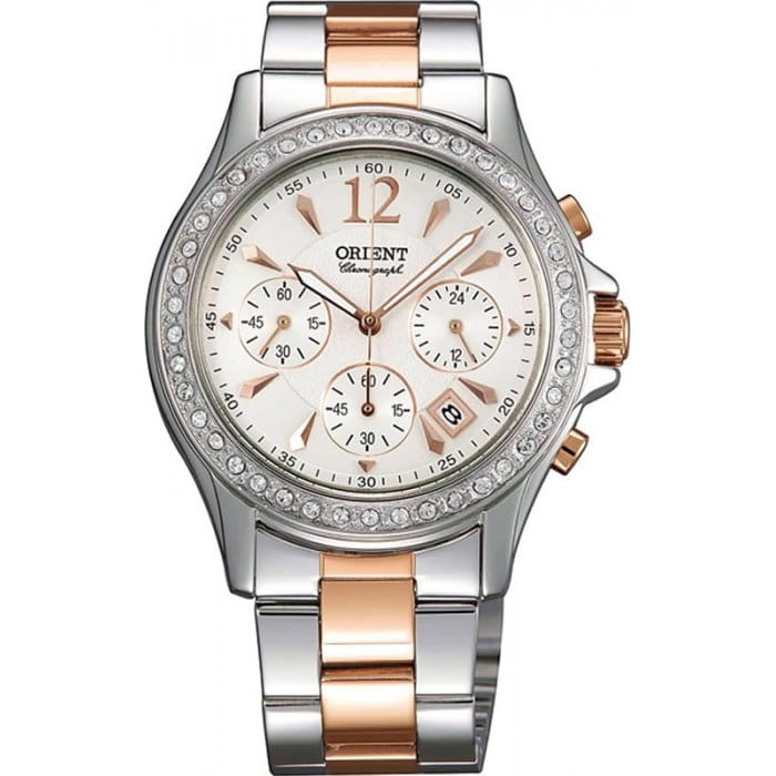 Женский кварцевый хронограф, корпус и браслет из нержавеющей стали с комбинированным покрытием розовое золото,  вставки кристаллы  Swarovski. Сапфировое стекло, водозащита 30м., индикатор даты. Диаметр 39.9 мм.