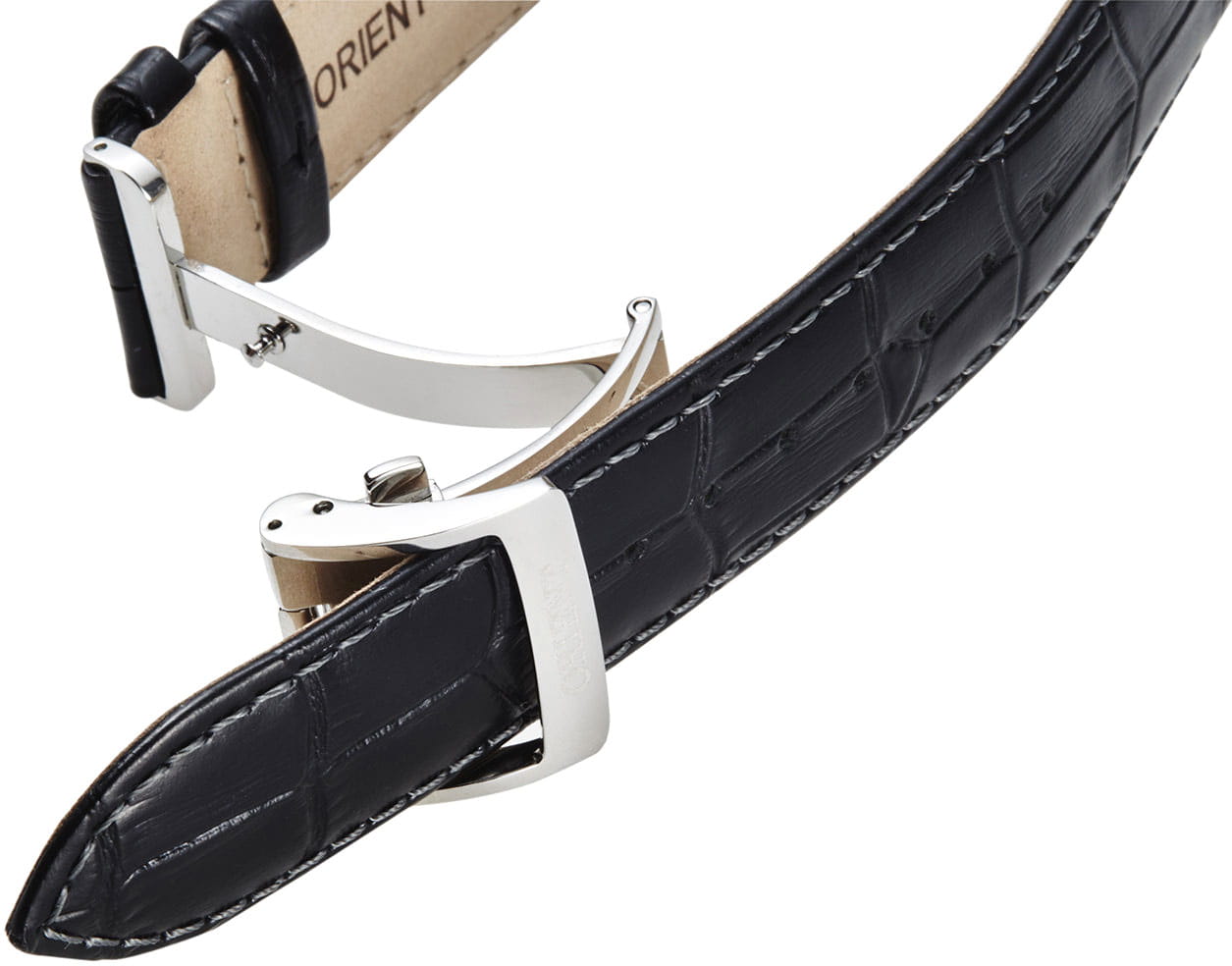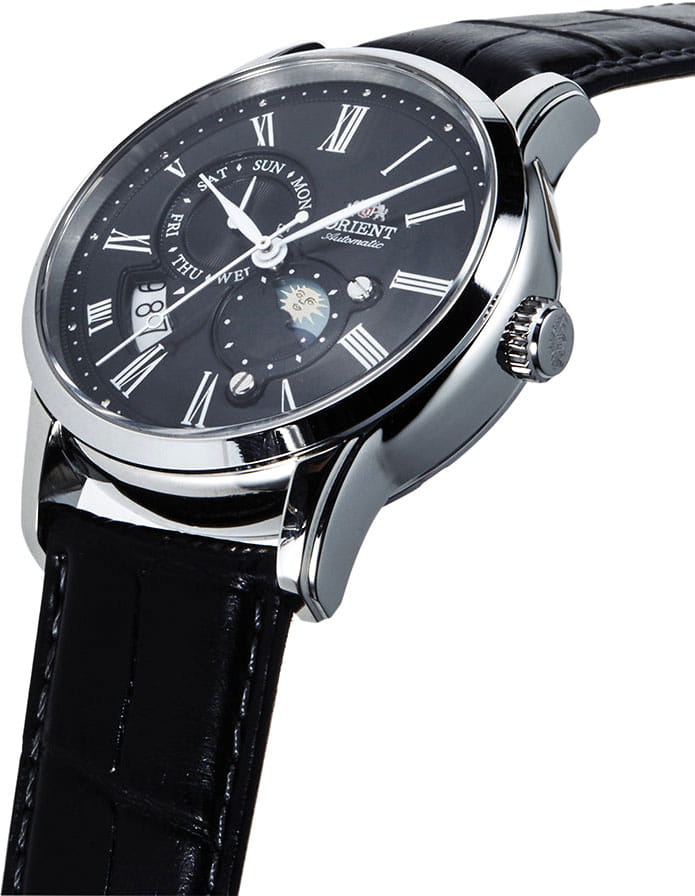 Мужские механические часы с автоподзаводом Orient Classic Automatic RA-AK00. Сапфировое стеклоСапфировое стеклоПрочный и надёжный материал из кристалла сапфира синтетического происхождения, характеризующийся особой твёрдостью и устойчивостью к царапинам и повреждениям. повышенной прозрачности, устойчивое к мелким механическим повреждениям. Корпус часов выполнен из нержавеющей стали. Циферблат часов оснащен индикатором дня и ночи, отдельный циферблат с отображением дня недели. Окошко даты находится в положении между 7 и 8 часов. Класс водозащиты: 50 метров, позволит защитить корпус от случайных брызг или капель дождя. Практичный кожаный ремешок с раскладной застёжкойРаскладная застёжкаТакой тип застёжки используется только на браслетах из металла. Она никогда не раскрывается полностью, происходит разделение на 2 и более частей. Раскладывающая застёжка снизит вероятность потери часов к минимуму..