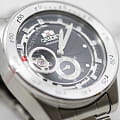 Orient RA-AR0201B — необычные и стильные часы из коллекции Revival, вдохновлённые эстетикой ретро-фотоаппаратов. Корпус диаметром 40,8 мм выполнен из нержавеющей стали с матовой отделкой. Безель стилизован под кольцо диафрагмы объектива, а заводная головка с защитой отсылает к рычагу перемотки плёнки, подчёркивая характерный винтажный образ. Чёрный циферблат с гильоше в форме лепестков оснащён открытым балансом на «9 часах» и малым секундным индикатором на «6 часах». Часовые метки и стрелки покрыты люминесцентным покрытиемЛюминесцентное покрытиеПозволяет считывать показания времени в темноте. Производители наносят на стрелки, часовые индексы, безель или поверхность циферблата светонакопительный состав, дающий холодное свечение. для надёжной читаемости в темноте. Циферблат защищён минеральным стекломМинеральное стеклоМинеральное стекло представляет собой искусственно выращенный минерал кварца. Такое стекло отличается особой устойчивостью к повреждениям и царапинам. Уступает по некоторым качествам сапфировому стеклу.. Внутри установлен японский автоматический механизм Orient F6S22 с 22 камнями, функцией ручного завода и стоп-секундой. Запас хода составляет до 40 часов. Модель комплектуется браслетом из нержавеющей стали с раскладной застёжкойРаскладная застёжкаТакой тип застёжки используется только на браслетах из металла. Она никогда не раскрывается полностью, происходит разделение на 2 и более частей. Раскладывающая застёжка снизит вероятность потери часов к минимуму., обеспечивающей надёжную посадку на запястье. Водонепроницаемость 50 метров делает часы устойчивыми к повседневным воздействиям воды.