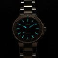 Многокомпонентный корпус из нержавеющей стали, керамический безельБезельВнешний ободок, закрепляющий стекло. В спортивных часах так называется поворотное кольцо с делениями на циферблате, выполняет роль таймера – замеряет отрезки времени на шкале. Неподвижный безель – элемент декора. Однонаправленно вращающийся безель на дайверских часах позволяет фиксировать моменты погружения и выныривания на поверхность. с минутной шкалой. Сапфировое стеклоСапфировое стеклоПрочный и надёжный материал из кристалла сапфира синтетического происхождения, характеризующийся особой твёрдостью и устойчивостью к царапинам и повреждениям., выпуклое с обеих сторон, внутреннее антибликовое покрытие. Стрелки и метки с люминесцентным покрытиемЛюминесцентное покрытиеПозволяет считывать показания времени в темноте. Производители наносят на стрелки, часовые индексы, безель или поверхность циферблата светонакопительный состав, дающий холодное свечение.. Завинчивающаяся прозрачная задняя крышка из минерального стеклаМинеральное стеклоМинеральное стекло представляет собой искусственно выращенный минерал кварца. Такое стекло отличается особой устойчивостью к повреждениям и царапинам. Уступает по некоторым качествам сапфировому стеклу..