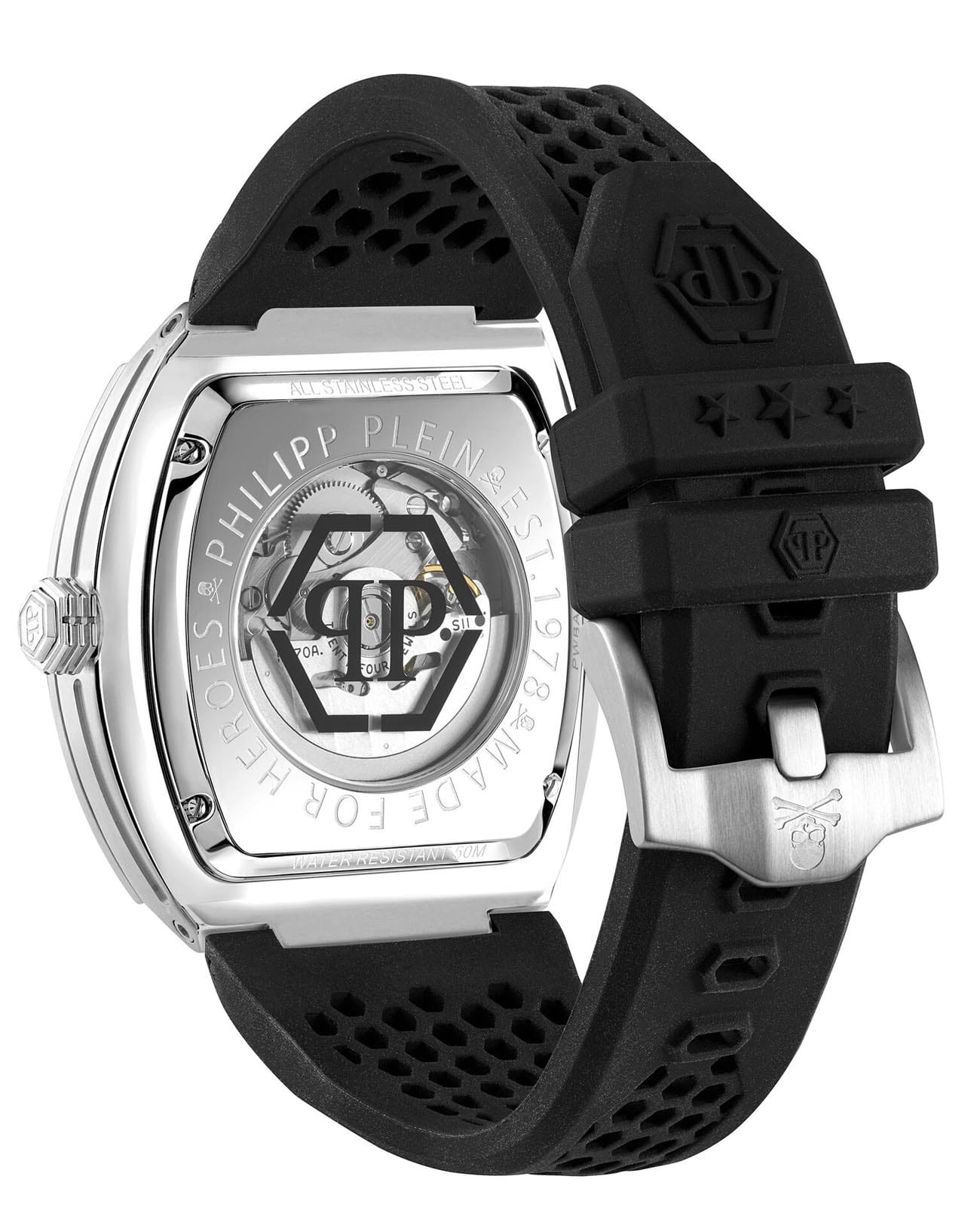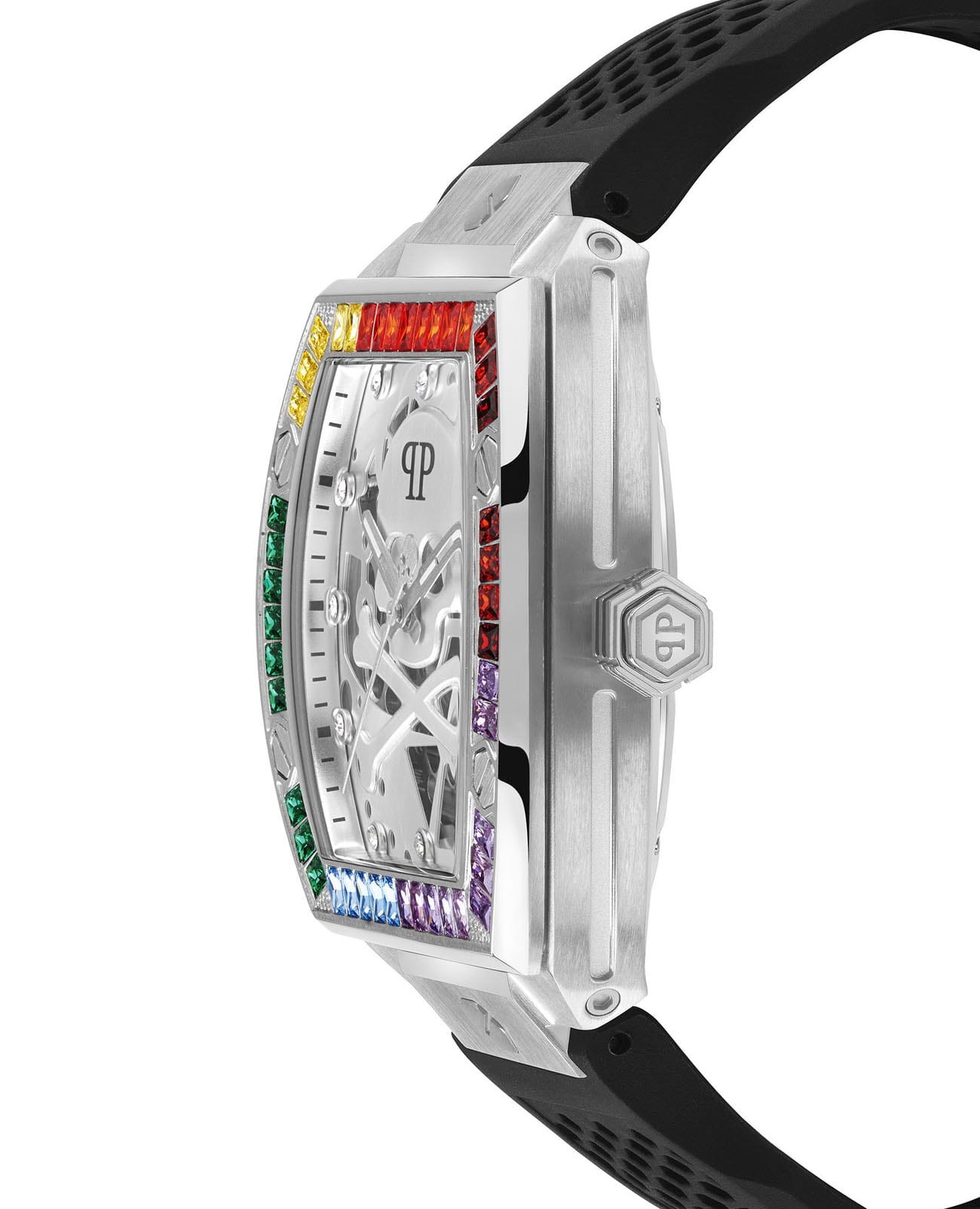 Мужские механические часы-скелетоны Philipp Plein The Skeleton PWBAA1423. Корпус часов изготовлен из нержавеющей стали. Минеральное стеклоМинеральное стеклоМинеральное стекло представляет собой искусственно выращенный минерал кварца. Такое стекло отличается особой устойчивостью к повреждениям и царапинам. Уступает по некоторым качествам сапфировому стеклу. устойчивое к мелким механическим повреждениям. Влагозащита: 50 метров, позволит защитить корпус от случайных брызг или капель дождя. Стрелки с люминесцентным покрытиемЛюминесцентное покрытиеПозволяет считывать показания времени в темноте. Производители наносят на стрелки, часовые индексы, безель или поверхность циферблата светонакопительный состав, дающий холодное свечение.. Практичный ремешок из силикона на стандартной застёжке. БезельБезельВнешний ободок, закрепляющий стекло. В спортивных часах так называется поворотное кольцо с делениями на циферблате, выполняет роль таймера – замеряет отрезки времени на шкале. Неподвижный безель – элемент декора. Однонаправленно вращающийся безель на дайверских часах позволяет фиксировать моменты погружения и выныривания на поверхность. и циферблат инкрустированы цветными кристаллами Preciosa.