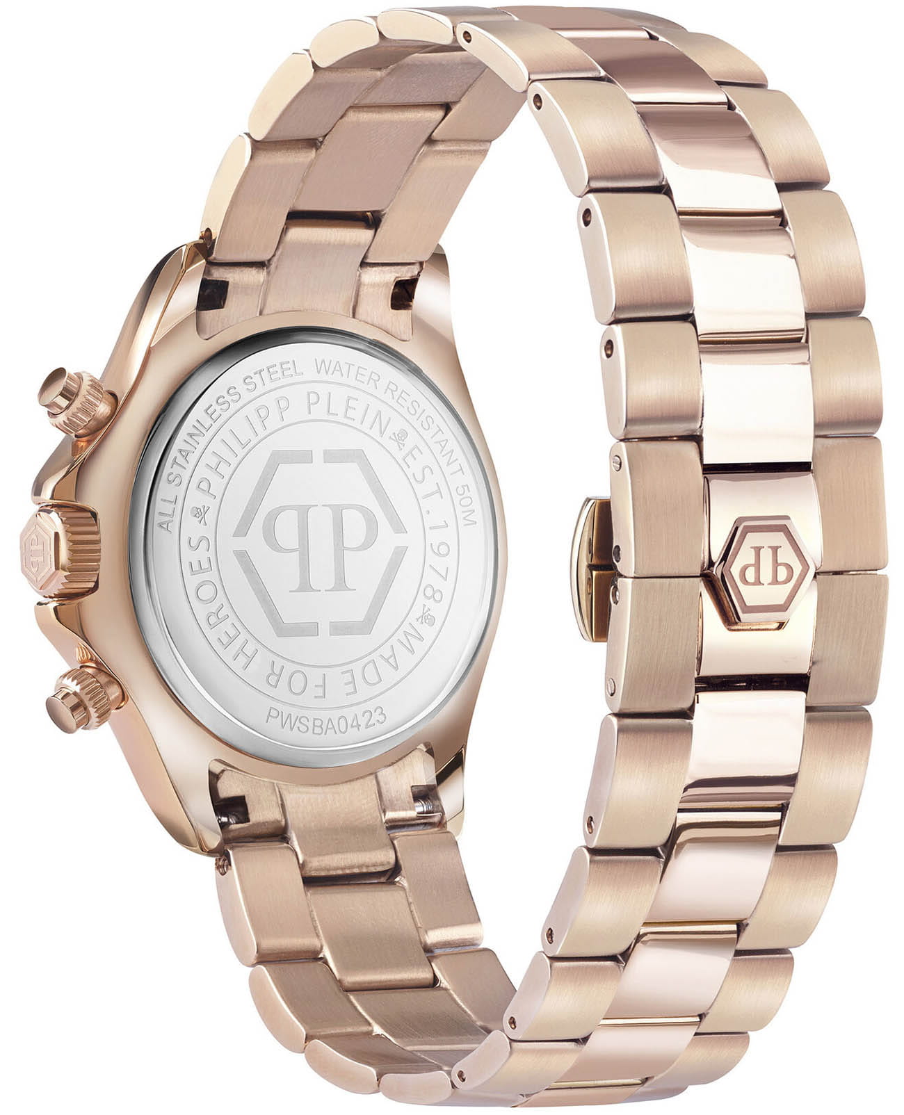 Яркие женские часы-хронографХронографФункция позволяет измерять отрезки времени с особой точностью: часы, минуты, секунды. Верным признаком хронографа является наличие на циферблате 3 дополнительных окошек-счётчиков. с секундомеромСекундомерСекундоме́р — прибор, способный измерять интервалы времени с точностью до долей секунды. Philipp Plein Nobile Lady PWSBA0423, кварцевый механизм с высокой точностью. 12 и 24-часовой формат времени. Класс водозащиты: 50 метров, позволит защитить корпус от случайных брызг или капель дождя. Корпус и браслет часов изготовлены из стали с IP-покрытиемIP-покрытиеМетод ионного напыления. Демонстрирует повышенную устойчивость к истиранию, окислению и химическим веществам. Под воздействием высокого давления и температуры около 1500°C молекулы металла надёжно соединяются с частицами корпуса часов.. Стрелки с люминесцентным покрытиемЛюминесцентное покрытиеПозволяет считывать показания времени в темноте. Производители наносят на стрелки, часовые индексы, безель или поверхность циферблата светонакопительный состав, дающий холодное свечение.. Стальной браслет на застёжке-бабочке с кнопкамиЗастёжка "бабочка"Такой вид застёжки дополняется предохранителями, помогающими избежать случайного раскрытия браслета. Обладают изящным исполнением. . Циферблат инкрустирован кристаллами Preciosa.