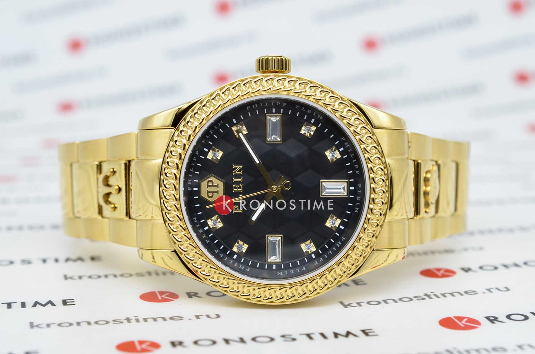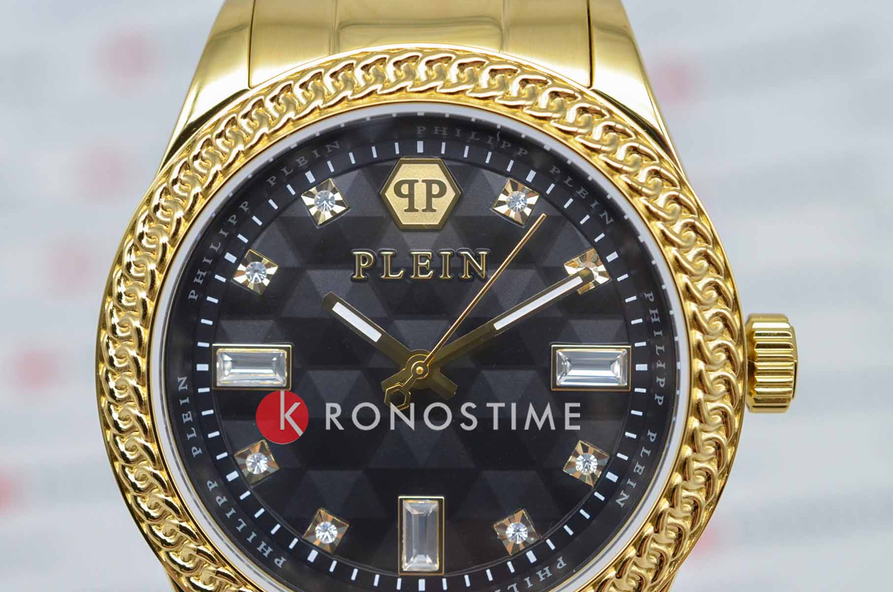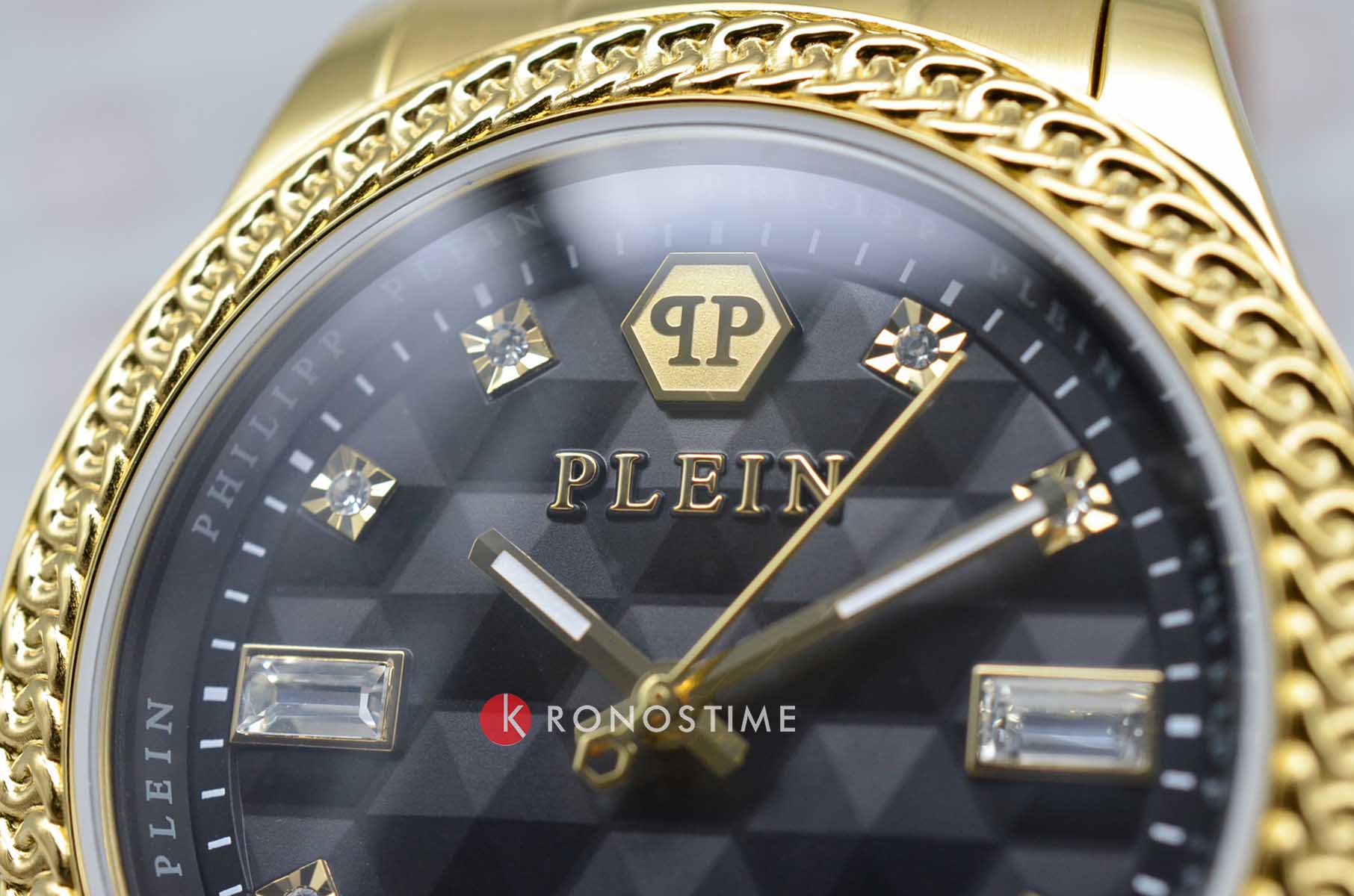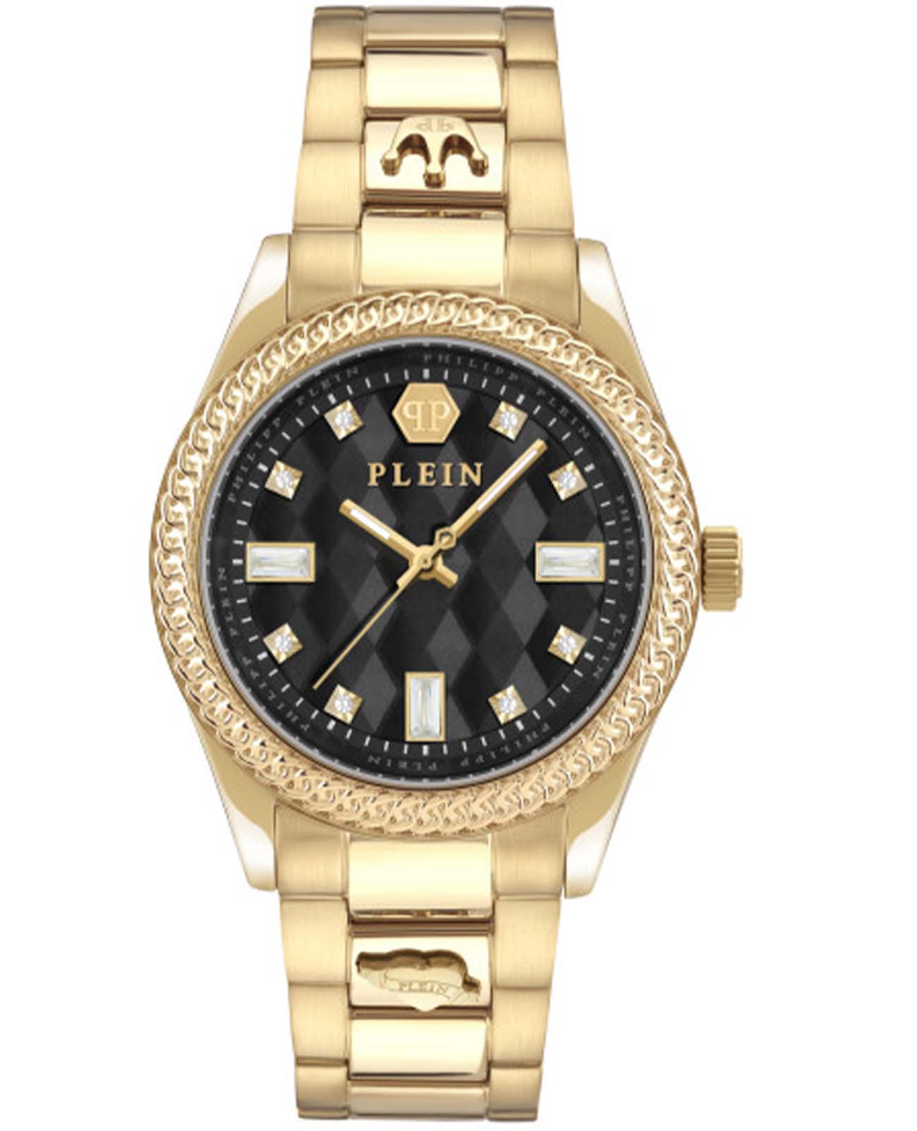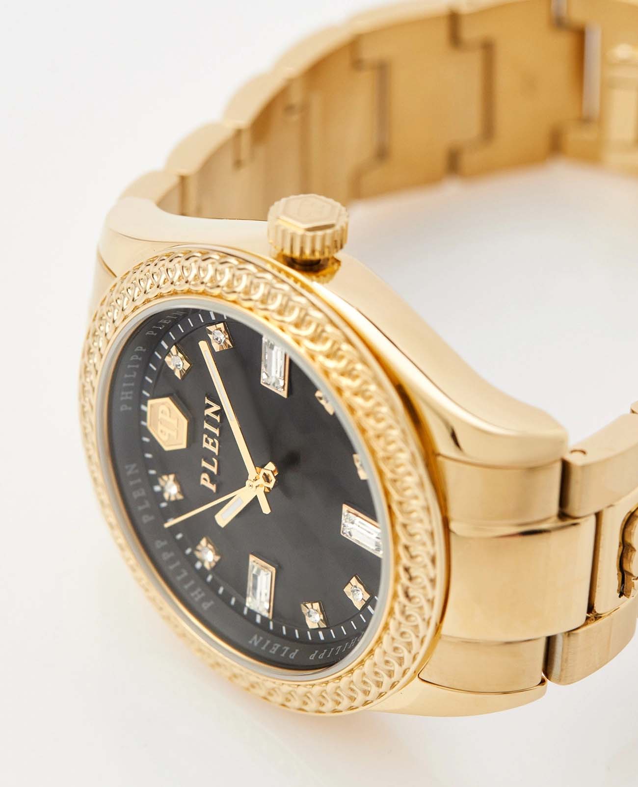 Часы Philipp Plein PWCDA0624 из коллекции Queen сочетают элегантность и функциональность. Корпус диаметром 38 мм выполнен из нержавеющей стали с PVD-покрытиемPVDУльтратонкое покрытие наносится в технике вакуумного напыления, сочетает в себе нитрид титана особой прочности со слоем золота или оксида хрома. Несёт в себе декоративную или защитную функцию., придающим изделию роскошный вид. БезельБезельВнешний ободок, закрепляющий стекло. В спортивных часах так называется поворотное кольцо с делениями на циферблате, выполняет роль таймера – замеряет отрезки времени на шкале. Неподвижный безель – элемент декора. Однонаправленно вращающийся безель на дайверских часах позволяет фиксировать моменты погружения и выныривания на поверхность. с PVD-покрытиемPVDУльтратонкое покрытие наносится в технике вакуумного напыления, сочетает в себе нитрид титана особой прочности со слоем золота или оксида хрома. Несёт в себе декоративную или защитную функцию..