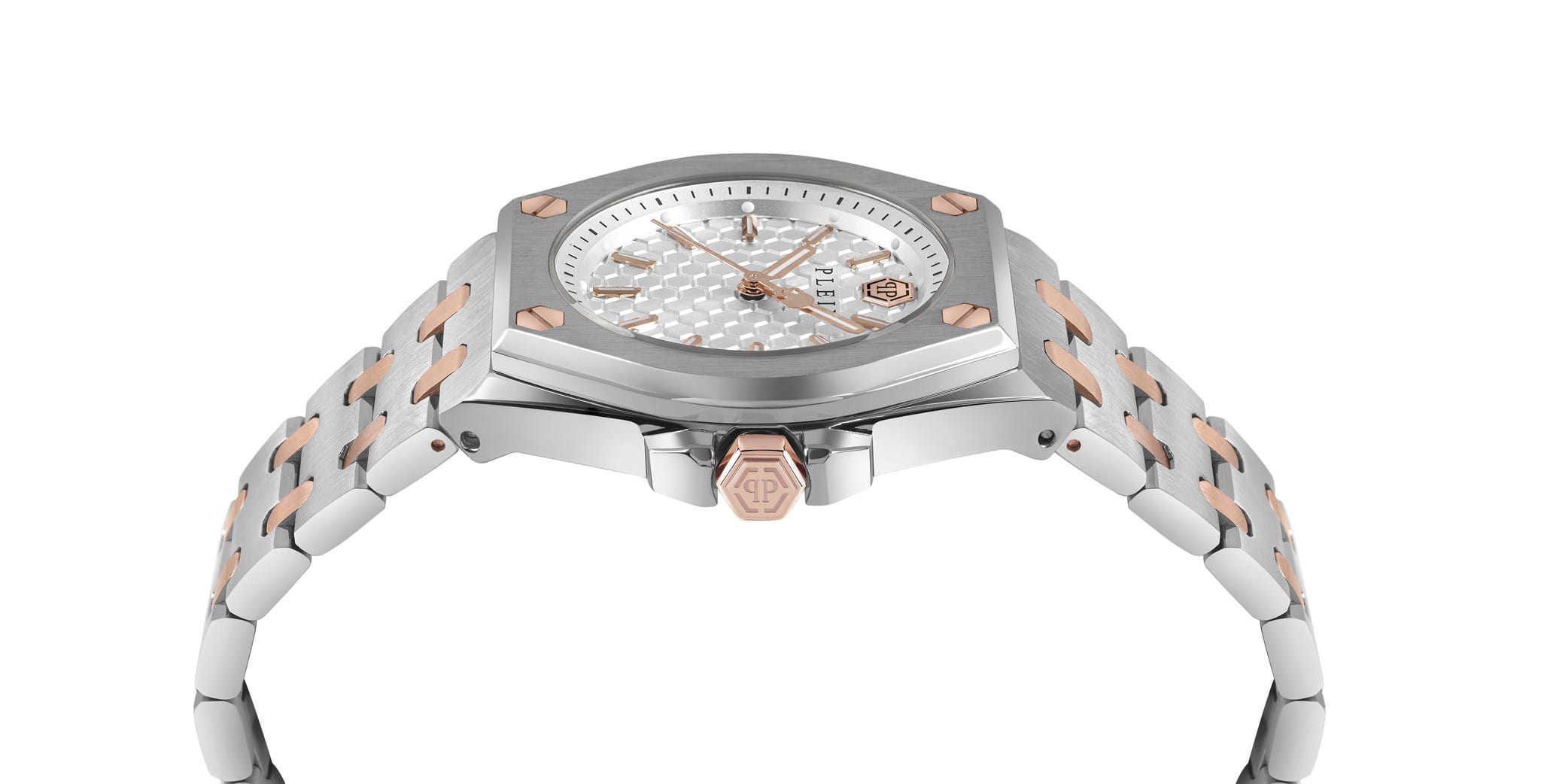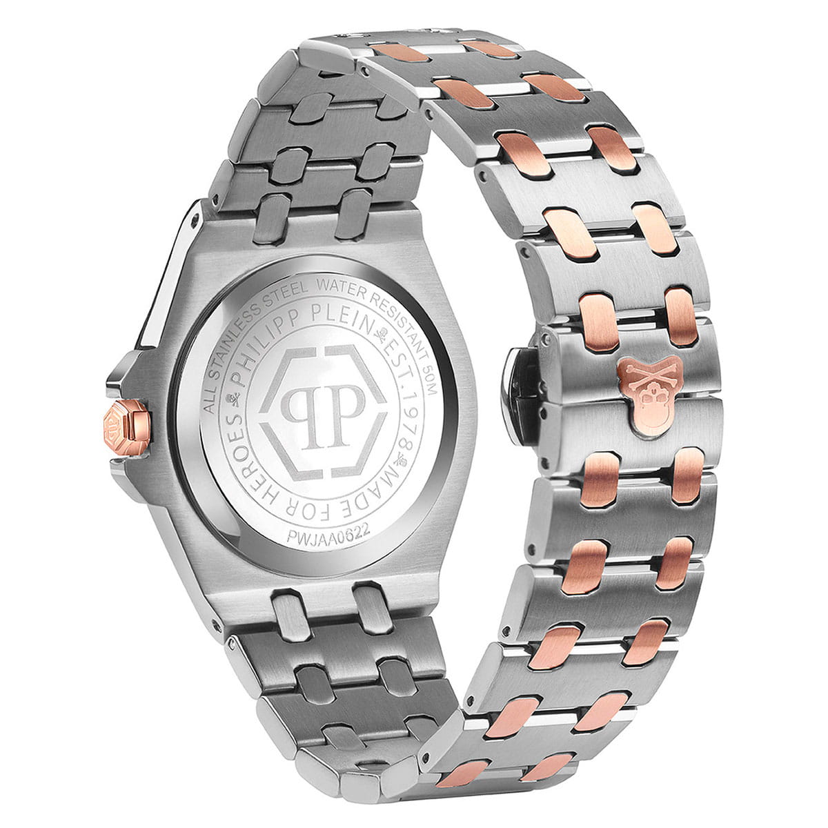 Женские немецкие кварцевые часы Philipp Plein Extreme Lady PWJAA0622, кварцевый механизм с высокой точностью. Класс водозащиты: 50 метров, позволит защитить корпус от случайных брызг или капель дождя. Корпус часов изготовлен из стали с частичным IP-покрытиемIP-покрытиеМетод ионного напыления. Демонстрирует повышенную устойчивость к истиранию, окислению и химическим веществам. Под воздействием высокого давления и температуры около 1500°C молекулы металла надёжно соединяются с частицами корпуса часов. цвета розовое золото. Прочное минеральное стеклоМинеральное стеклоМинеральное стекло представляет собой искусственно выращенный минерал кварца. Такое стекло отличается особой устойчивостью к повреждениям и царапинам. Уступает по некоторым качествам сапфировому стеклу. устойчивое к мелким механическим повреждениям. Стальной браслет с частичным IP-покрытиемIP-покрытиеМетод ионного напыления. Демонстрирует повышенную устойчивость к истиранию, окислению и химическим веществам. Под воздействием высокого давления и температуры около 1500°C молекулы металла надёжно соединяются с частицами корпуса часов. цвета розового золота шириной 23 мм, раскладная застёжкаРаскладная застёжкаТакой тип застёжки используется только на браслетах из металла. Она никогда не раскрывается полностью, происходит разделение на 2 и более частей. Раскладывающая застёжка снизит вероятность потери часов к минимуму..
