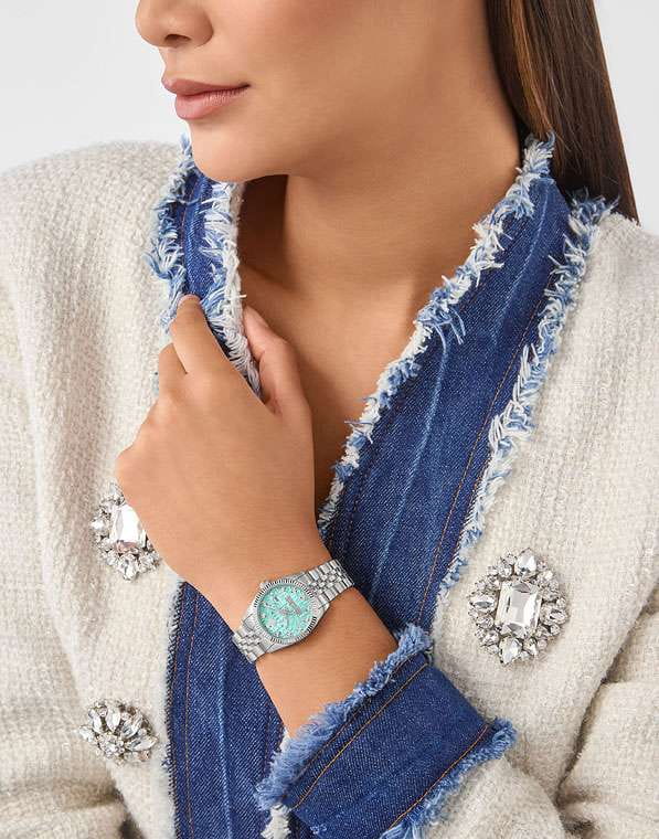 Philipp Plein DATE SUPERLATIVE PWNFA0225 - дерзкое заявление любви к роскоши и бунтарскому стилю. Диаметр круглого корпуса из прочной нержавеющей стали равен 28 мм. Стальной браслет на застёжке «бабочка» с кнопкамиЗастёжка "бабочка"Такой вид застёжки дополняется предохранителями, помогающими избежать случайного раскрытия браслета. Обладают изящным исполнением. обеспечивает надёжную фиксацию и комфортное ношение. Метки в виде кристаллов Preciosa. Минеральное стеклоМинеральное стеклоМинеральное стекло представляет собой искусственно выращенный минерал кварца. Такое стекло отличается особой устойчивостью к повреждениям и царапинам. Уступает по некоторым качествам сапфировому стеклу. защищает циферблат от царапин. Люминесцентное покрытиеЛюминесцентное покрытиеПозволяет считывать показания времени в темноте. Производители наносят на стрелки, часовые индексы, безель или поверхность циферблата светонакопительный состав, дающий холодное свечение. стрелок и меток позволит следить за временем даже в полной темноте. Граненая заводная головка. Влагозащита: 50 метров, позволит защитить корпус от случайных брызг или капель дождя. Идеальный аксессуар для тех, кто ценит индивидуальность и не боится выделяться из толпы.