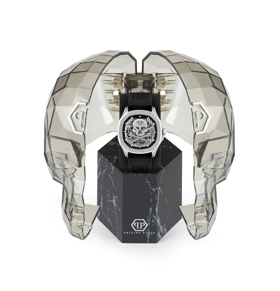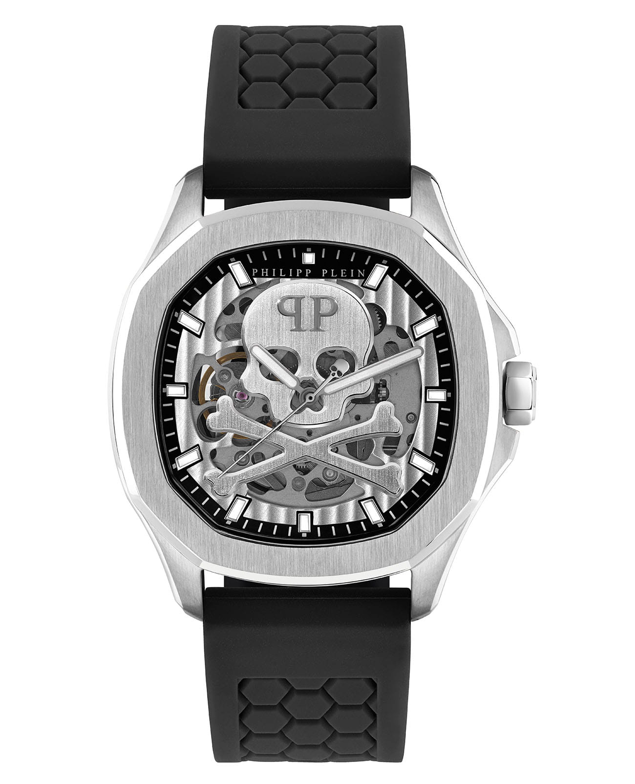 Яркие мужские часы с минеральным стекломМинеральное стеклоМинеральное стекло представляет собой искусственно выращенный минерал кварца. Такое стекло отличается особой устойчивостью к повреждениям и царапинам. Уступает по некоторым качествам сапфировому стеклу. Philipp Plein PWRAA0123, механический механизм. Класс водозащиты: 50 метров, позволит защитить корпус от случайных брызг или капель дождя. Корпус часов изготовлен из стали. Стрелки и метки с люминесцентным покрытиемЛюминесцентное покрытиеПозволяет считывать показания времени в темноте. Производители наносят на стрелки, часовые индексы, безель или поверхность циферблата светонакопительный состав, дающий холодное свечение.. Скелетонизированные. Часы с механизмом, из которого удалён весь «лишний» металл, с прозрачными циферблатом и задней крышкой,