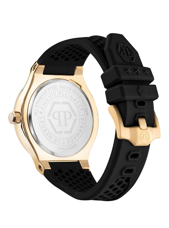 Philipp Plein Plein Underdog PWUFA0225 - это дерзкие и бескомпромиссные часы, воплощающие бунтарский дух бренда. Диаметр корпуса из прочной нержавеющей стали с PVD-покрытиемPVDУльтратонкое покрытие наносится в технике вакуумного напыления, сочетает в себе нитрид титана особой прочности со слоем золота или оксида хрома. Несёт в себе декоративную или защитную функцию. равен 44 мм. Силиконовый ремешок на стандартной застёжке обеспечивает надёжную фиксацию и комфортное ношение. Метки в виде штрихов. Минеральное стеклоМинеральное стеклоМинеральное стекло представляет собой искусственно выращенный минерал кварца. Такое стекло отличается особой устойчивостью к повреждениям и царапинам. Уступает по некоторым качествам сапфировому стеклу. защищает циферблат от царапин. Люминесцентное покрытиеЛюминесцентное покрытиеПозволяет считывать показания времени в темноте. Производители наносят на стрелки, часовые индексы, безель или поверхность циферблата светонакопительный состав, дающий холодное свечение. стрелок и меток позволит следить за временем даже в полной темноте. Граненая заводная головка. Влагозащита: 50 метров, позволит защитить корпус от случайных брызг или капель дождя. Идеальный аксессуар для тех, кто ценит индивидуальность и не боится выделяться из толпы.