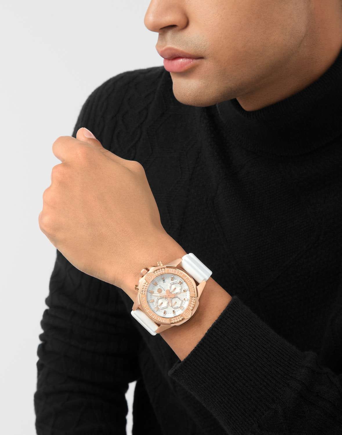 Philipp Plein The $kull Chrono PWWFA0325 - яркие часы-хронографХронографФункция позволяет измерять отрезки времени с особой точностью: часы, минуты, секунды. Верным признаком хронографа является наличие на циферблате 3 дополнительных окошек-счётчиков. в революционном дизайне несомненно добавят вам выразительности и станут главным акцентом вашего стильного образа. Мужские кварцевые часы с высокой точностью. Круглый стальной корпус с PVD-покрытиемPVDУльтратонкое покрытие наносится в технике вакуумного напыления, сочетает в себе нитрид титана особой прочности со слоем золота или оксида хрома. Несёт в себе декоративную или защитную функцию. цвета розового золота, диаметром 44 мм. Метки в виде штрихов. Минеральное стеклоМинеральное стеклоМинеральное стекло представляет собой искусственно выращенный минерал кварца. Такое стекло отличается особой устойчивостью к повреждениям и царапинам. Уступает по некоторым качествам сапфировому стеклу. защищает циферблат от царапин. Люминесцентное покрытиеЛюминесцентное покрытиеПозволяет считывать показания времени в темноте. Производители наносят на стрелки, часовые индексы, безель или поверхность циферблата светонакопительный состав, дающий холодное свечение. стрелок и меток позволит следить за временем даже в полной темноте. Окошко даты находится в положении 4 часа. Силиконовый ремешок на стандартной застёжке, обеспечивает комфортное ношение. Граненая заводная головка. Влагозащита: 50 метров, позволит защитить корпус от случайных брызг или капель дождя. Идеальный аксессуар для тех, кто ценит индивидуальность и не боится выделяться из толпы.