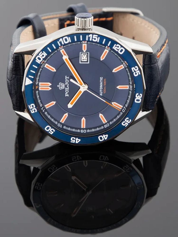 Poljot NH35A.181261 — надёжные механические мужские часы с автоподзаводом, сочетающие техническую точность и выразительный спортивный стиль. Корпус из нержавеющей стали подчёркивает прочность конструкции, а насыщенный циферблат с акцентами на стрелках и метках придаёт модели динамичный и современный облик. БезельБезельВнешний ободок, закрепляющий стекло. В спортивных часах так называется поворотное кольцо с делениями на циферблате, выполняет роль таймера – замеряет отрезки времени на шкале. Неподвижный безель – элемент декора. Однонаправленно вращающийся безель на дайверских часах позволяет фиксировать моменты погружения и выныривания на поверхность. с PVD-покрытиемPVDУльтратонкое покрытие наносится в технике вакуумного напыления, сочетает в себе нитрид титана особой прочности со слоем золота или оксида хрома. Несёт в себе декоративную или защитную функцию.. Внутри установлен проверенный японский механизм SEIKO NH35, обеспечивающий стабильную работу и плавный ход секундной стрелки. Окно даты добавляет функциональности, а широкие метки с люминесцентным покрытиемЛюминесцентное покрытиеПозволяет считывать показания времени в темноте. Производители наносят на стрелки, часовые индексы, безель или поверхность циферблата светонакопительный состав, дающий холодное свечение. обеспечивают отличную читаемость даже в темноте. Прочное минеральное стеклоМинеральное стеклоМинеральное стекло представляет собой искусственно выращенный минерал кварца. Такое стекло отличается особой устойчивостью к повреждениям и царапинам. Уступает по некоторым качествам сапфировому стеклу. защищает циферблат от царапин, а ремешок из натуральной кожи с контрастной прострочкой гарантирует комфорт и надёжную посадку. Poljot — часы с характером, созданные для тех, кто ценит точность, качество и спортивную уверенность в каждой детали.