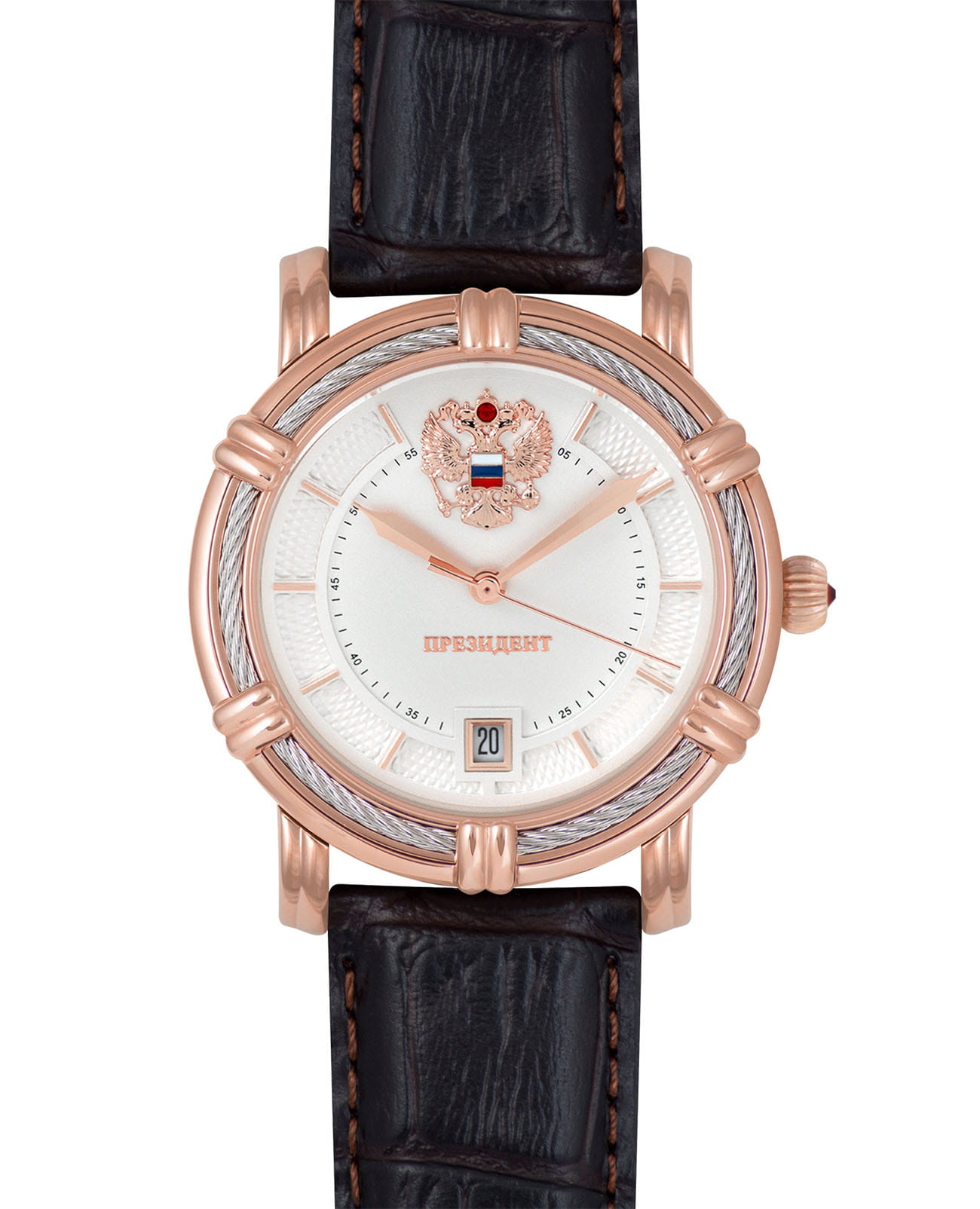 Мужские часы из коллекции «Президент» — это воплощение стиля, точности и российского качества. Модель выполнена в круглой форме с корпусом диаметром 37 мм и толщиной 11 мм, а также украшена кристаллами Swarovski на циферблате, что придаёт ей изысканность и блеск. Защиту механизма обеспечивает минеральное стеклоМинеральное стеклоМинеральное стекло представляет собой искусственно выращенный минерал кварца. Такое стекло отличается особой устойчивостью к повреждениям и царапинам. Уступает по некоторым качествам сапфировому стеклу., устойчивое к мелким повреждениям. Часы оснащены механизмом с автоподзаводом, обеспечивающим надёжную работу и минимальное обслуживание. Задняя крышка с чеканкой Герба России подчёркивает национальный стиль и уникальность модели. В комплект поставки входят подарочный футляр, паспорт с гарантийным талоном и фирменный пакет, что делает их идеальным выбором как для повседневного использования, так и для подарка. Водонепроницаемость позволяет использовать часы в повседневных условиях — при мытье рук или под лёгким дождём. Кожаный ремешок шириной 20 мм обеспечивает комфорт и элегантный внешний вид. Эти часы станут универсальным аксессуаром для тех, кто ценит сочетание эстетики, функциональности и российского мастерства — идеальный выбор для уверенных в себе мужчин, следящих за своим имиджем и предпочитающих выделяться.