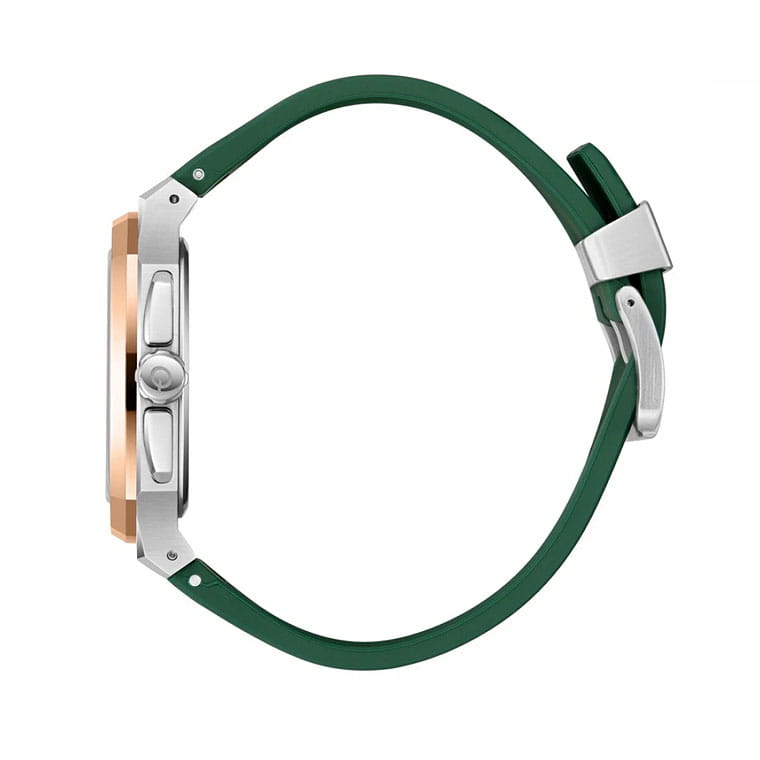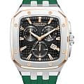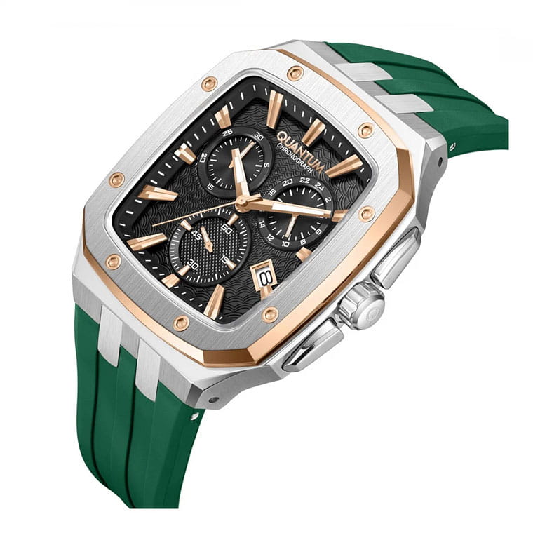 Мужские кварцевые часы Quantum из коллекции Hunter — стильный прямоугольный корпус размером 44 мм из нержавеющей стали. БезельБезельВнешний ободок, закрепляющий стекло. В спортивных часах так называется поворотное кольцо с делениями на циферблате, выполняет роль таймера – замеряет отрезки времени на шкале. Неподвижный безель – элемент декора. Однонаправленно вращающийся безель на дайверских часах позволяет фиксировать моменты погружения и выныривания на поверхность. с частичным PVD-покрытиемPVDУльтратонкое покрытие наносится в технике вакуумного напыления, сочетает в себе нитрид титана особой прочности со слоем золота или оксида хрома. Несёт в себе декоративную или защитную функцию., чёрный циферблат с функциями хронографаХронографФункция позволяет измерять отрезки времени с особой точностью: часы, минуты, секунды. Верным признаком хронографа является наличие на циферблате 3 дополнительных окошек-счётчиков., секундомера и окошком даты. Стекло — минеральноеМинеральное стеклоМинеральное стекло представляет собой искусственно выращенный минерал кварца. Такое стекло отличается особой устойчивостью к повреждениям и царапинам. Уступает по некоторым качествам сапфировому стеклу. с антибликовым покрытием. Механизм — японский кварцевый Seiko. Водонепроницаемость 100 м. Ремешок — зелёный силиконовый на стандартной застёжке. Идеальный выбор для тех, кто ценит турецкий дизайн и спортивный характер.