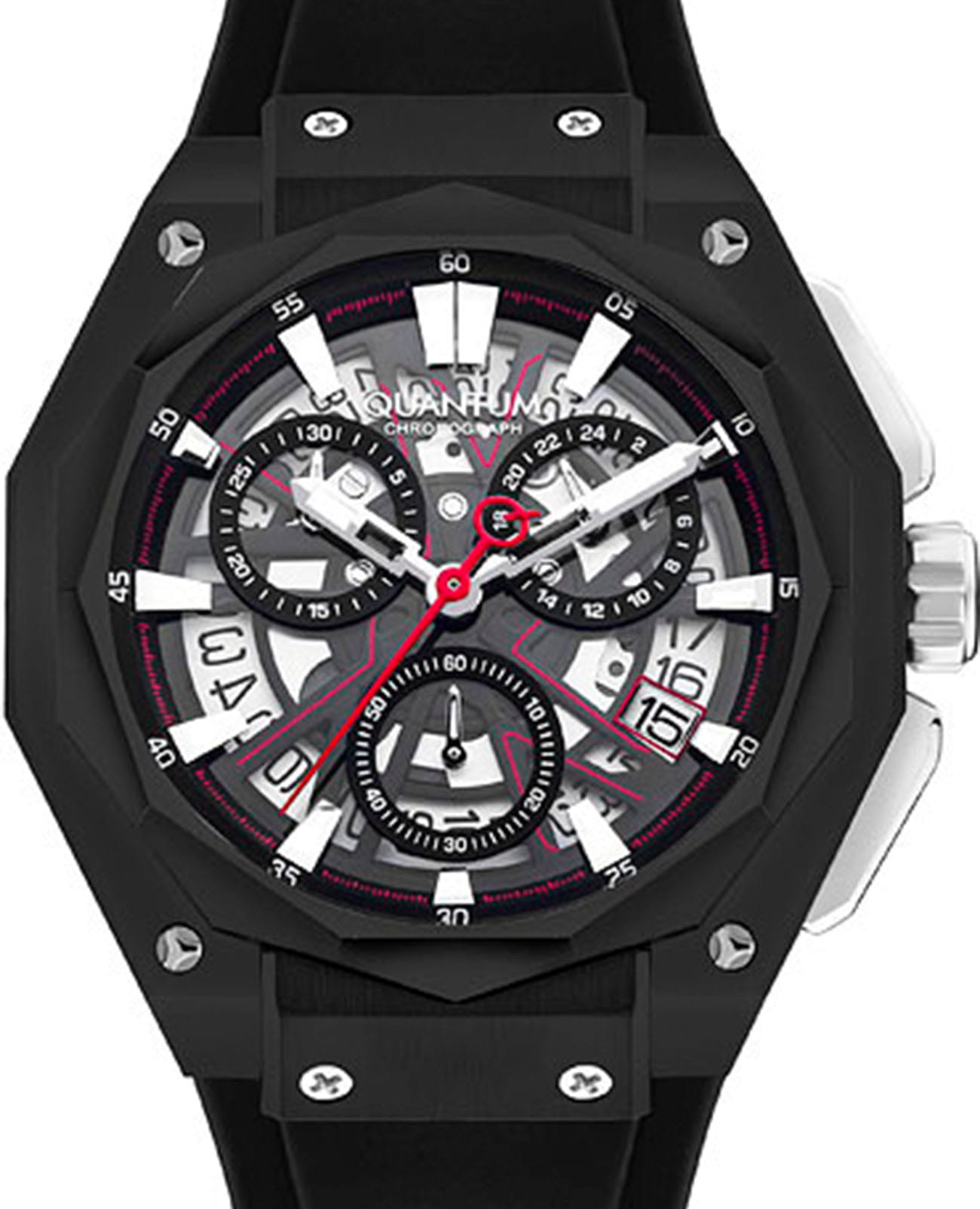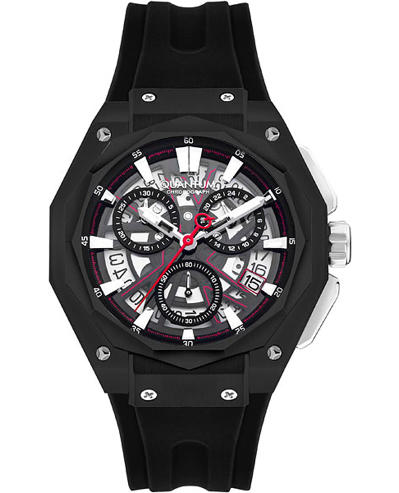 Мужские кварцевые часы Quantum HNG1097.651 из коллекции Hunter — круглый корпус размером 47 мм из нержавеющей стали с PVD-покрытиемPVDУльтратонкое покрытие наносится в технике вакуумного напыления, сочетает в себе нитрид титана особой прочности со слоем золота или оксида хрома. Несёт в себе декоративную или защитную функцию., оснащённый функциями хронографаХронографФункция позволяет измерять отрезки времени с особой точностью: часы, минуты, секунды. Верным признаком хронографа является наличие на циферблате 3 дополнительных окошек-счётчиков., секундомера и окошком даты. Стрелки и метки с люминесцентным покрытиемЛюминесцентное покрытиеПозволяет считывать показания времени в темноте. Производители наносят на стрелки, часовые индексы, безель или поверхность циферблата светонакопительный состав, дающий холодное свечение.. Стекло — минеральноеМинеральное стеклоМинеральное стекло представляет собой искусственно выращенный минерал кварца. Такое стекло отличается особой устойчивостью к повреждениям и царапинам. Уступает по некоторым качествам сапфировому стеклу. с антибликовым покрытием. Механизм — японский кварцевый Seiko. Водонепроницаемость 100 м. Ремешок — чёрный силиконовый на стандартной застёжке. Идеальный выбор для тех, кто ценит турецкий дизайн и функциональный повседневный стиль.