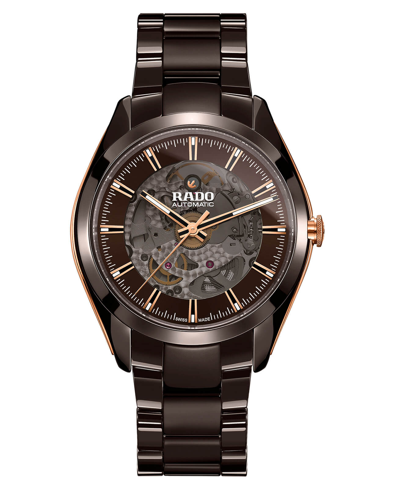 Уникальные часы скелетоны коричневого оттенка выставляют «напоказ» всю работу, движение деталей и шестерёнок отлично просматривается через прозрачную заднюю крышку и центральное окошко в циферблате. Он дополнен стрелками и часовыми метками, что позволяет без затруднений считывать показания времени. Стильная модель сделана из высокотехнологичной керамикиВысокотехнологичная керамикаИнновационный запатентованный Rado материал с гладкой или матовой поверхностью. Керамика за счёт кристаллической структуры обладает повышенной устойчивостью от возникновения царапин. Материал способен принимать температуру тела человека, обеспечивая невероятный комфорт при ношении.. Работа обеспечивается автоматическим швейцарским калибром ETA C07.631 с запасом хода 80 часов. Водостойкость 50 метров. Антибликовое покрытие стекла из сапфира. Диаметр корпуса: 42 мм.