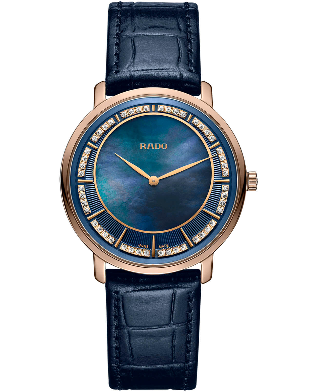 Насыщенный синий оттенок позволит сделать яркий цветовой акцент в вашем индивидуальном образе, а лаконичное исполнение не позволит выйти за рамки дресс-кода. Модель премиальной категории имеет перламутровый циферблат с роскошным декором в виде 48 бриллиантов общим весом 0,182 карата, никто не способен устоять перед таким исполнением. Кварцевый механизм ETA 282.002. Корпус из высокотехнологичного сплава CeramosCeramosМатериал являет собой инновационное сочетание высокотехнологичной керамики и сплава металла. Он объединяет керамическую устойчивость к царапинам и металлический роскошный блеск. цвета розового золота. Сапфировое стекло невозможно поцарапать. Ремешок из натуральной кожи. Диаметр корпуса: 37,8 мм.