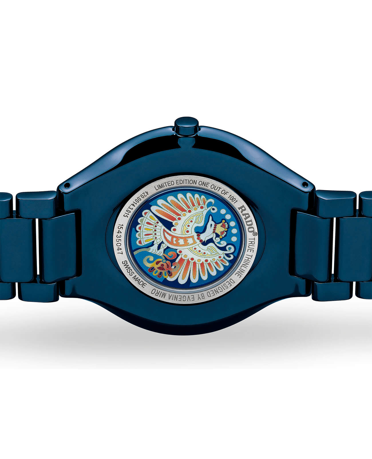 Оригинальный аксессуар в синем цвете привлекает «русскими мотивами»: задняя крышка украшена цветным изображением Жар-Птицы, а корпус, циферблат и браслет из высокотехнологичной керамикиВысокотехнологичная керамикаИнновационный запатентованный Rado материал с гладкой или матовой поверхностью. Керамика за счёт кристаллической структуры обладает повышенной устойчивостью от возникновения царапин. Материал способен принимать температуру тела человека, обеспечивая невероятный комфорт при ношении. декорированы узором в виде птичьего пера. Кварцевый калибр ETA 282.002 с высокой точностью хода. Антибликовая обработка сапфирового стекла. Водонепроницаемость до 3 бар. . Диаметр корпуса: 39 мм.
