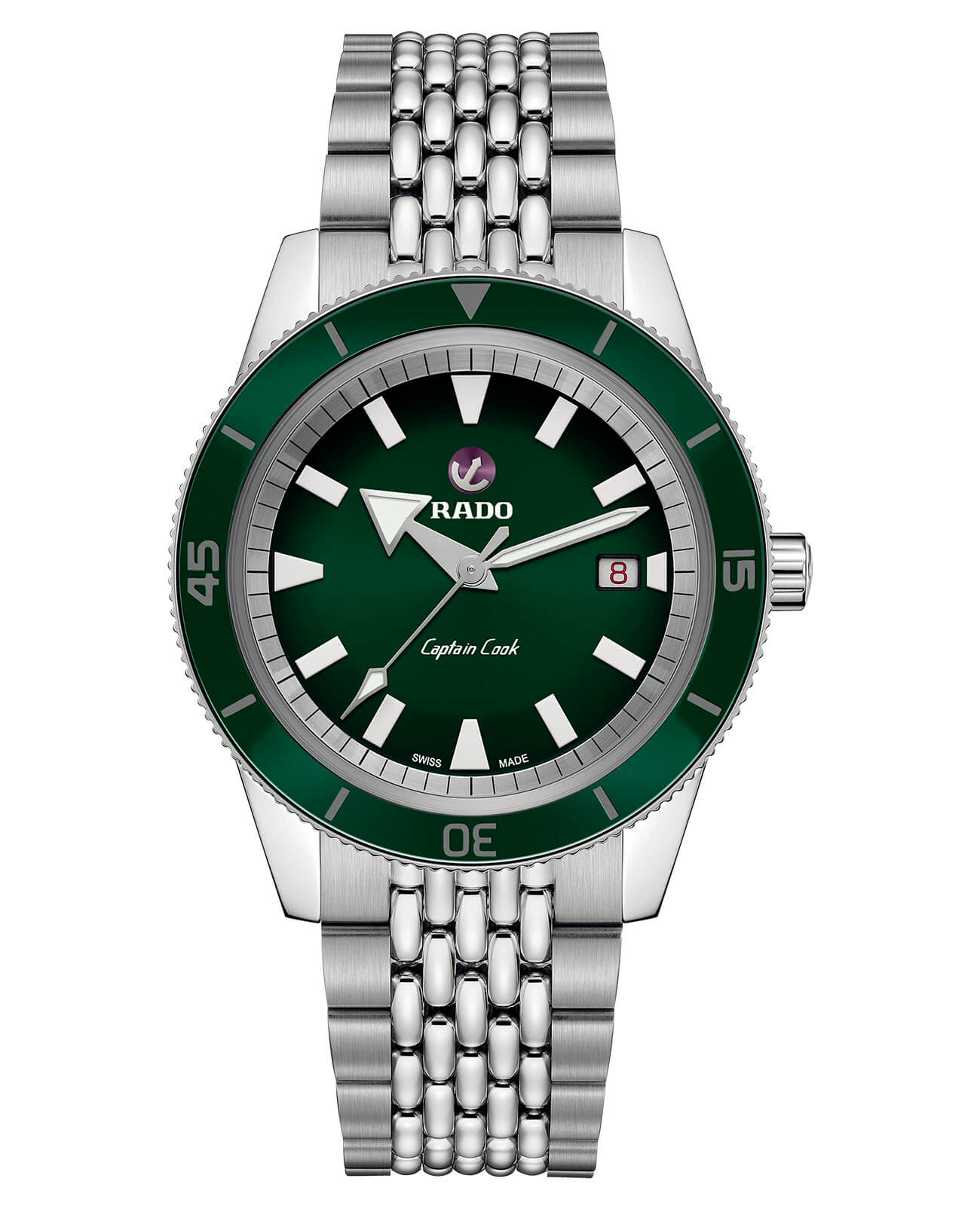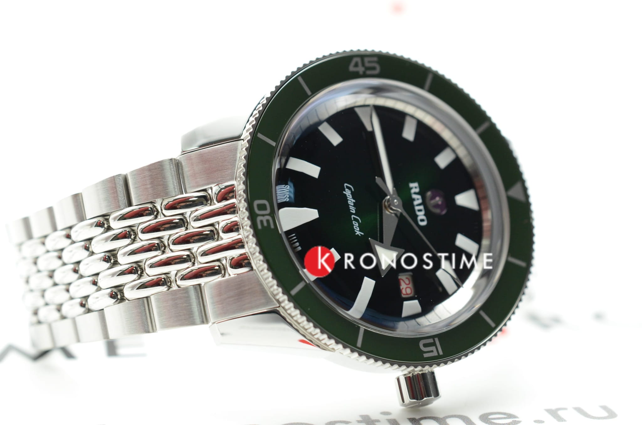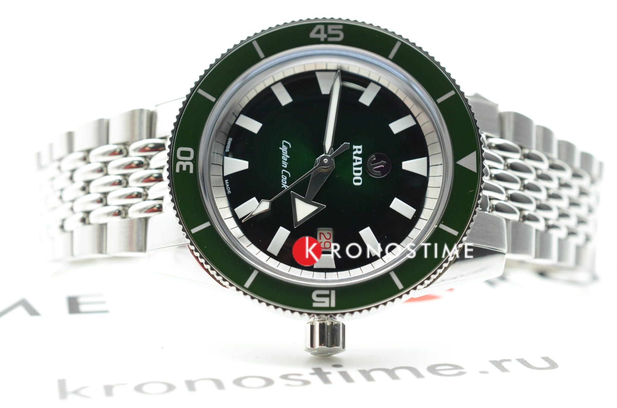 Премиальная модель обладает винтажным характером, зелёный циферблат обращает наше внимание на оригинальные стрелки в виде меча и стрелы. Часы обладают высокими показателями водонепроницаемости - сохранение герметичности до 20 бар, что стало возможным благодаря задней крышке и заводной головке с винтовыми фиксаторами. Автоподзавод. Швейцарский калибр ETA C07.611 с 80-часовым резервом хода. Антибликовая обработка сапфирового стекла. Корпус из хирургической стали 316L, безельБезельВнешний ободок, закрепляющий стекло. В спортивных часах так называется поворотное кольцо с делениями на циферблате, выполняет роль таймера – замеряет отрезки времени на шкале. Неподвижный безель – элемент декора. Однонаправленно вращающийся безель на дайверских часах позволяет фиксировать моменты погружения и выныривания на поверхность. из высокотехнологичной керамикиВысокотехнологичная керамикаИнновационный запатентованный Rado материал с гладкой или матовой поверхностью. Керамика за счёт кристаллической структуры обладает повышенной устойчивостью от возникновения царапин. Материал способен принимать температуру тела человека, обеспечивая невероятный комфорт при ношении.. Прочный стальной браслет. Отображение числа. Диаметр корпуса: 42 мм.
