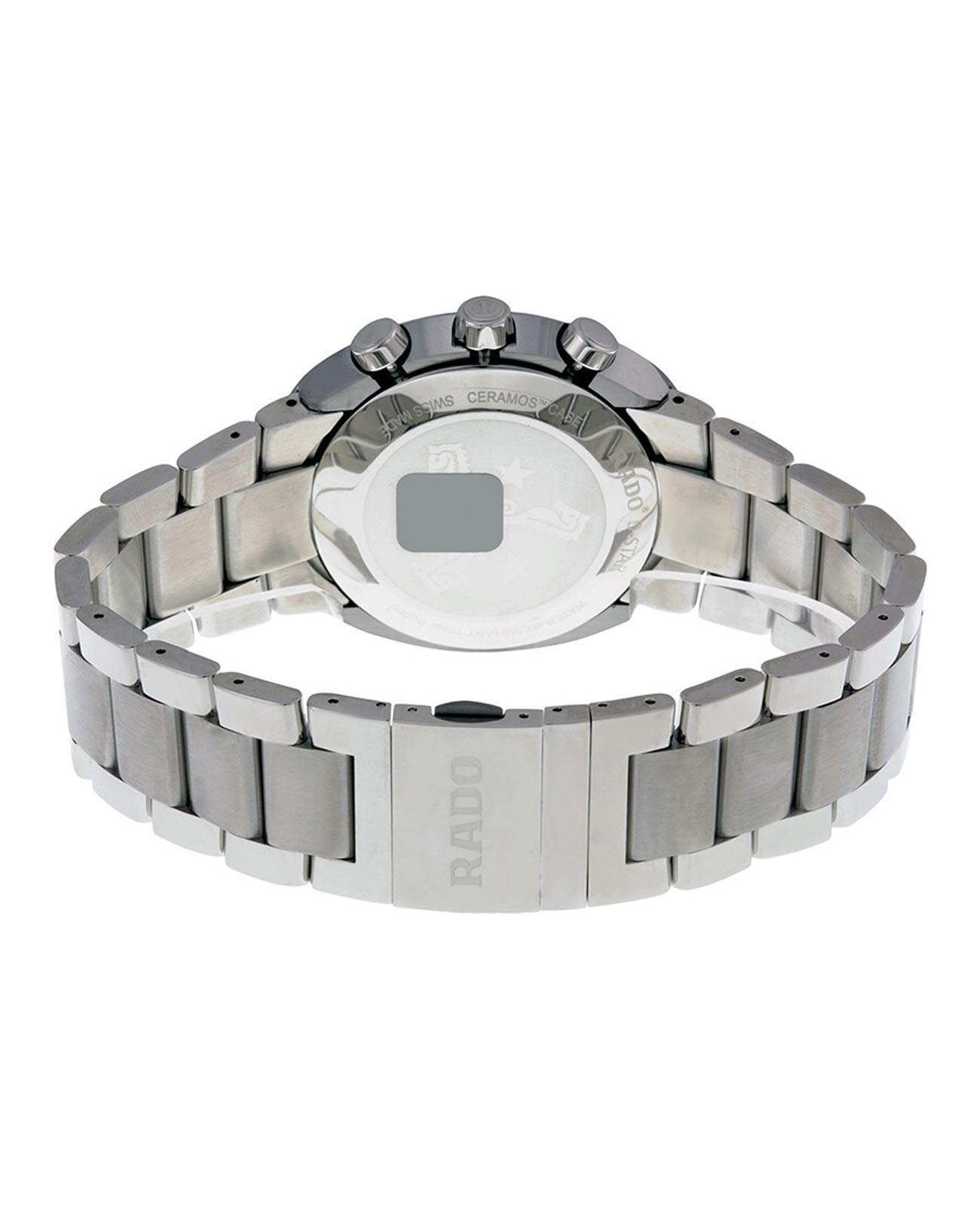 Мужские швейцарские часы- хронографХронографФункция позволяет измерять отрезки времени с особой точностью: часы, минуты, секунды. Верным признаком хронографа является наличие на циферблате 3 дополнительных окошек-счётчиков. Rado D-Star Chronograph R15937203. Сапфировое стеклоСапфировое стеклоПрочный и надёжный материал из кристалла сапфира синтетического происхождения, характеризующийся особой твёрдостью и устойчивостью к царапинам и повреждениям. устойчивое к мелким механическим повреждениям. Корпус часов изготовлен из CeramosCeramosМатериал являет собой инновационное сочетание высокотехнологичной керамики и сплава металла. Он объединяет керамическую устойчивость к царапинам и металлический роскошный блеск. . Окошко даты находится в положении 3 часа. Класс водозащиты: 100 метров, позволит плавать, нырять и заниматься другими водными видами спорт. Браслет из нержавеющей стали на раскладной застёжкеРаскладная застёжкаТакой тип застёжки используется только на браслетах из металла. Она никогда не раскрывается полностью, происходит разделение на 2 и более частей. Раскладывающая застёжка снизит вероятность потери часов к минимуму..