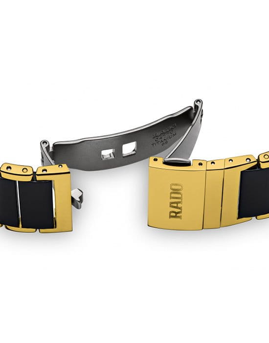 Браслет часов выполнен из стали с PVD-покрытиемPVDУльтратонкое покрытие наносится в технике вакуумного напыления, сочетает в себе нитрид титана особой прочности со слоем золота или оксида хрома. Несёт в себе декоративную или защитную функцию. и высокотехнологичной керамикиВысокотехнологичная керамикаИнновационный запатентованный Rado материал с гладкой или матовой поверхностью. Керамика за счёт кристаллической структуры обладает повышенной устойчивостью от возникновения царапин. Материал способен принимать температуру тела человека, обеспечивая невероятный комфорт при ношении., что придаёт им дополнительную прочность и комфорт при ношении. Застёжка выполнена в виде «бабочки»Застёжка "бабочка"Такой вид застёжки дополняется предохранителями, помогающими избежать случайного раскрытия браслета. Обладают изящным исполнением. , что обеспечивает удобную и надёжную фиксацию на запястье.