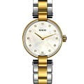 Наручные часы обладают уникальным дизайном, оригинальные ушки, скрепляющие корпус с браслетом, весьма привлекательно смотрятся. Светлый перламутровый циферблат изящно смотрится на женском запястье, 12 бриллиантов в 0,038 карат - роскошное дополнение и красота. Кварцевый высокоточный механизм ETA 280.002. Износоустойчивое PVD-покрытиеPVDУльтратонкое покрытие наносится в технике вакуумного напыления, сочетает в себе нитрид титана особой прочности со слоем золота или оксида хрома. Несёт в себе декоративную или защитную функцию. золотистого оттенка. Сохранение водостойкости при давлении 5 бар. Стекло из сапфира. Диаметр корпуса: 27 мм.
